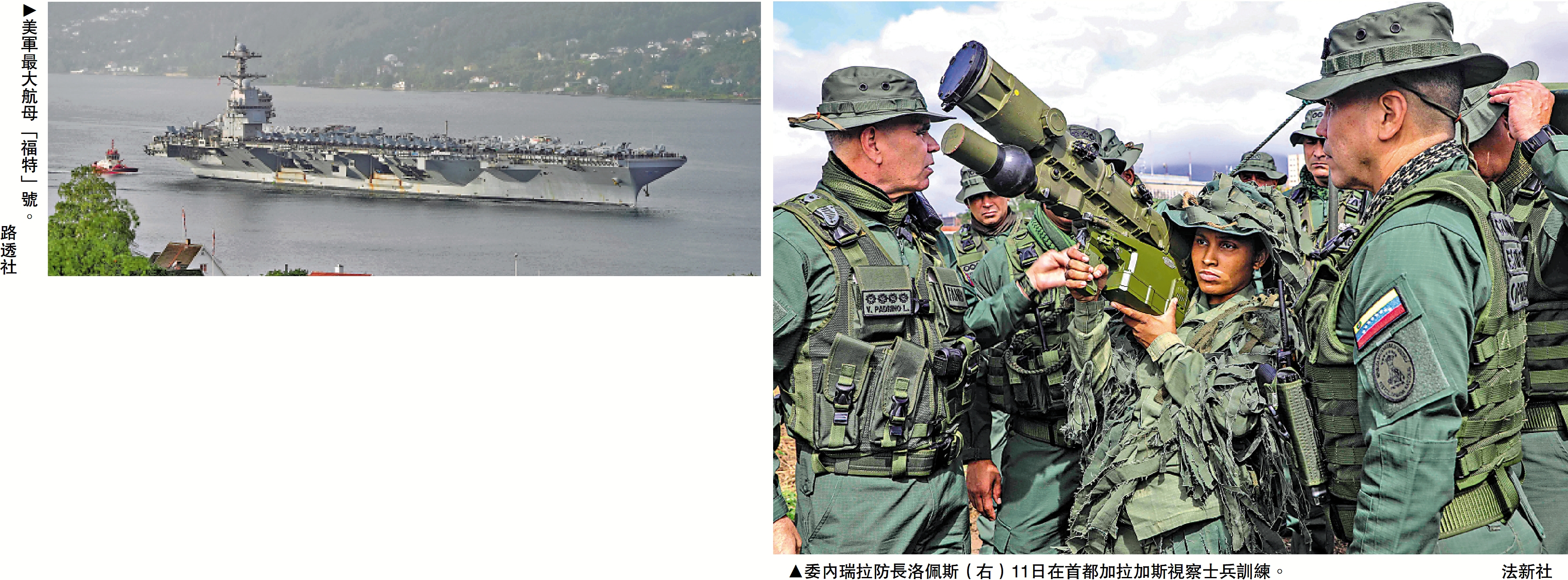 大公報綜合報道,美國海軍11日發表聲明稱,美軍最大航母「福特」號率領的航母打擊群當天抵達美軍南方司令部責任區,部署在加勒比海。至此,美國以「掃毒」為名,在加勒比地區已集結逾1.5萬兵力、十餘艘戰艦、上百架戰機,規模為數十年來最大。聯合國人權事務高級專員圖爾克此前表示,美方所謂「掃毒」行動違反國際法,構成「非法殺戮」。哥倫比亞總統佩特羅11日宣布暫停與美國情報合作;同日媒體報道,英國、加拿大亦相繼暫停與美共享情報。