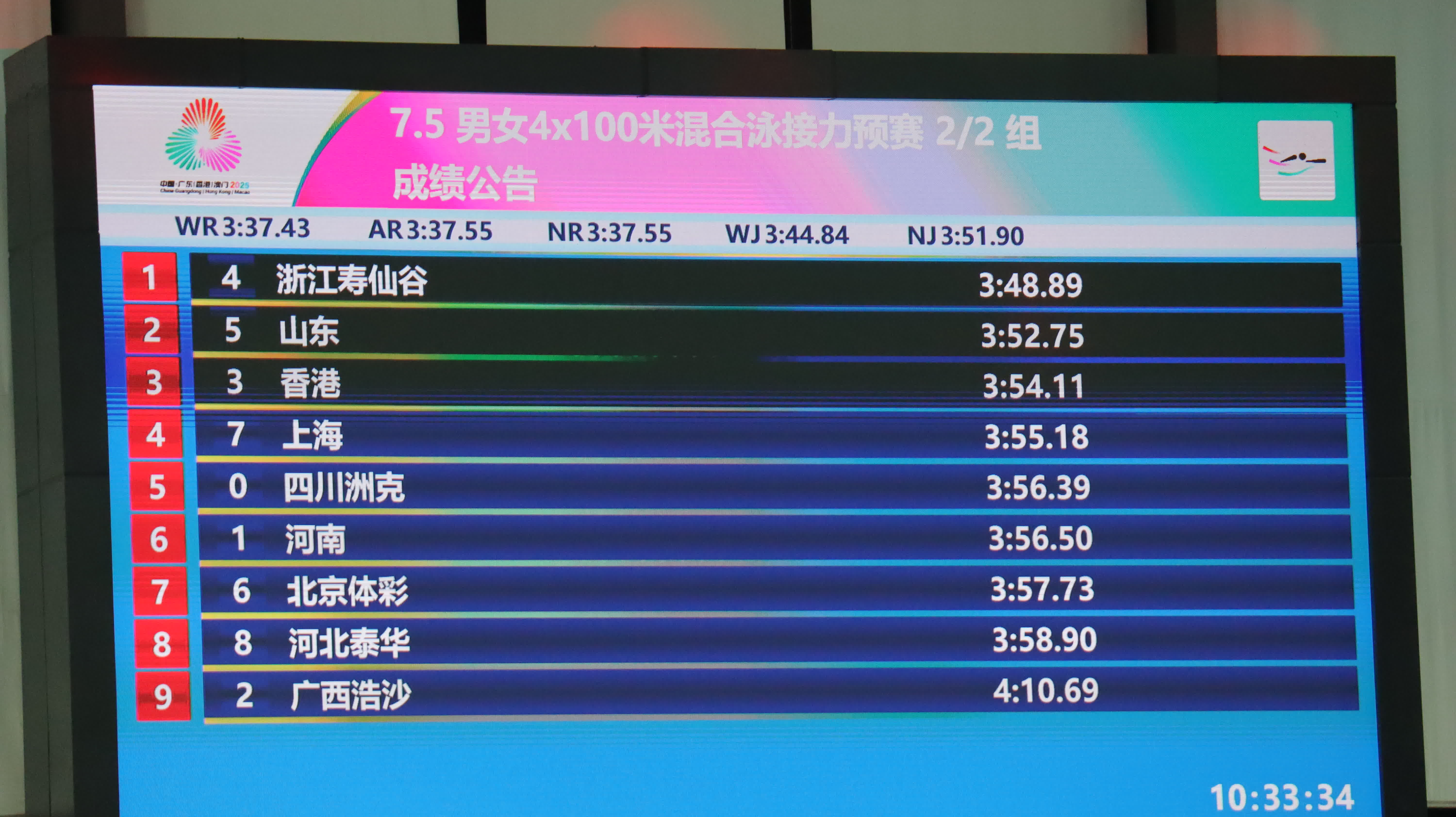 (大公文匯網 記者 夏方芳)在剛剛結束的第十五屆全運會男女4×100米混合泳接力預賽中,香港隊游出了3分54秒11的成績,以小組第三、總成績第六的身份,成功晉級今晚舉行的決賽。
