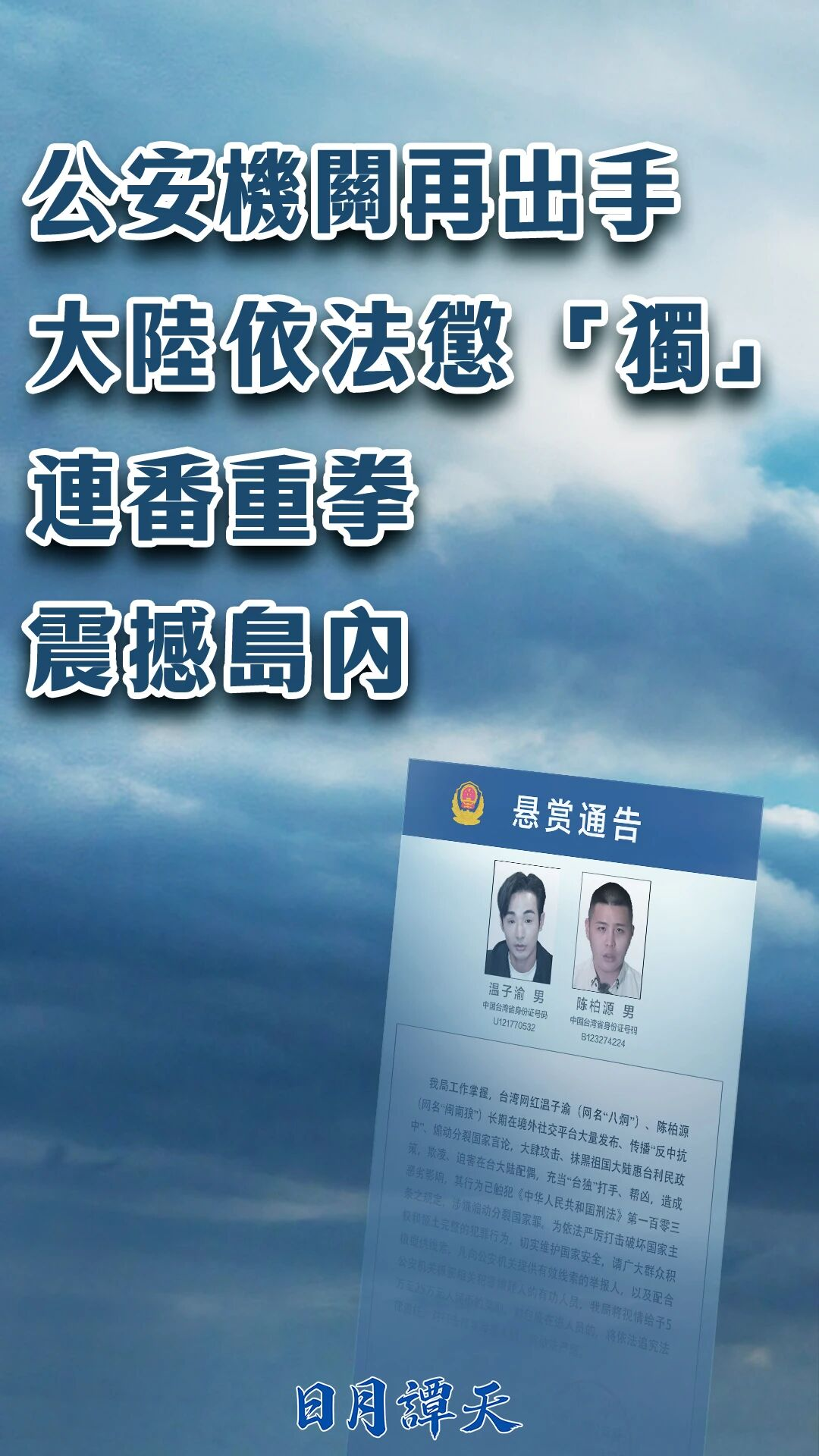 誠如國台辦發言人陳斌華所言,公安機關懸賞徵集溫子渝、陳柏源違法犯罪線索,是依法懲治分裂國家、煽動分裂國家犯罪的具體行動,是回應兩岸民眾懲「獨」呼聲的正義之舉,正當必要。對這些宵小之輩必須依法嚴懲、終身追責。譚主想說,大陸依法懲「獨」多箭齊發,威力十足,嚇壞了鷹犬爪牙,刺破了民進黨當局的心虛膽怯,刺穿了「台獨」幻夢。任何人、任何勢力都不應再心存僥倖,膽敢分裂國家、煽動分裂國家,必遭嚴懲!