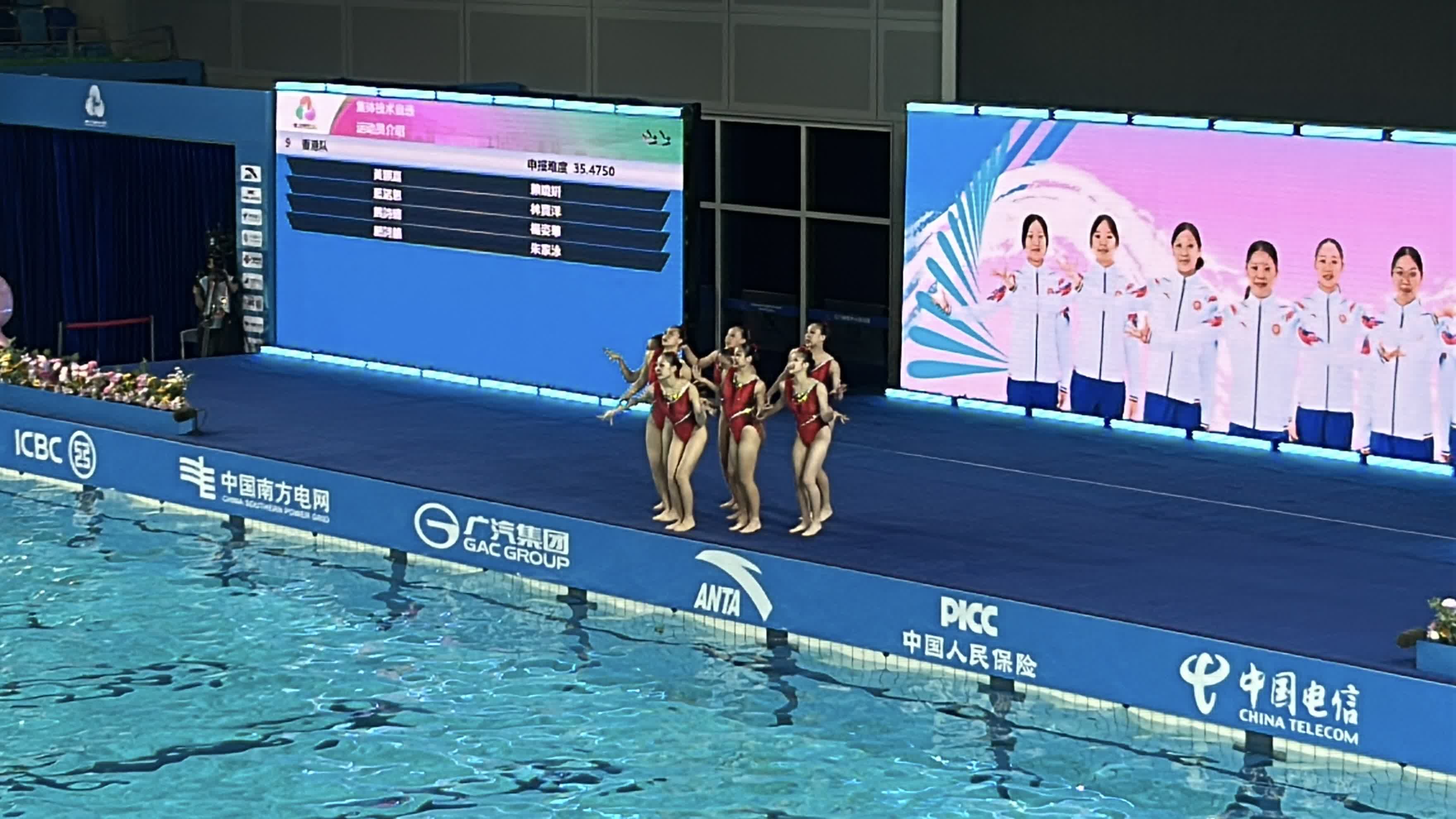 (大公文匯網記者 敖敏輝 江門報道)11月13日,備受關注的十五運會花樣游泳項目在江門體育中心游泳館開賽,來自全國的10支隊伍參加了率先舉行的集體項目比賽,香港隊有8名運動員參賽。花樣游泳是一項結合舞蹈、音樂和游泳技巧的水上競技項目,分為雙人、集體等不同形式,強調動作協調性、藝術表現力和團隊配合。當天上午,集體賽技術自選項目比賽中,北京體育大學隊以294.7008分暫列第一,香港隊以163.2283暫列第10名。