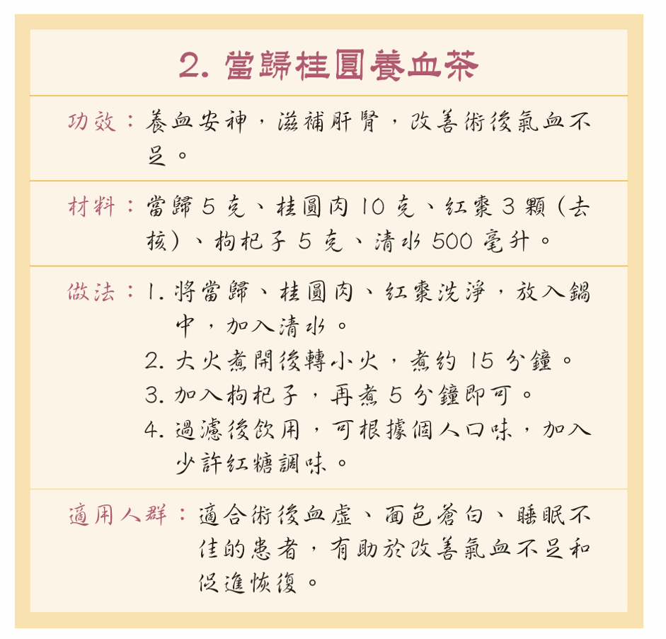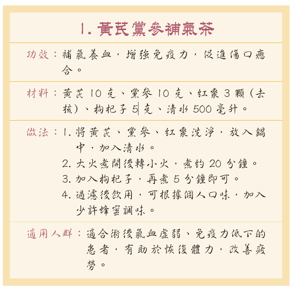 - 避免活血化瘀:術後初期(約 2 周內),避免使用活血化瘀類中藥(如:丹參、川芎、紅花等),以免影響傷口癒合。