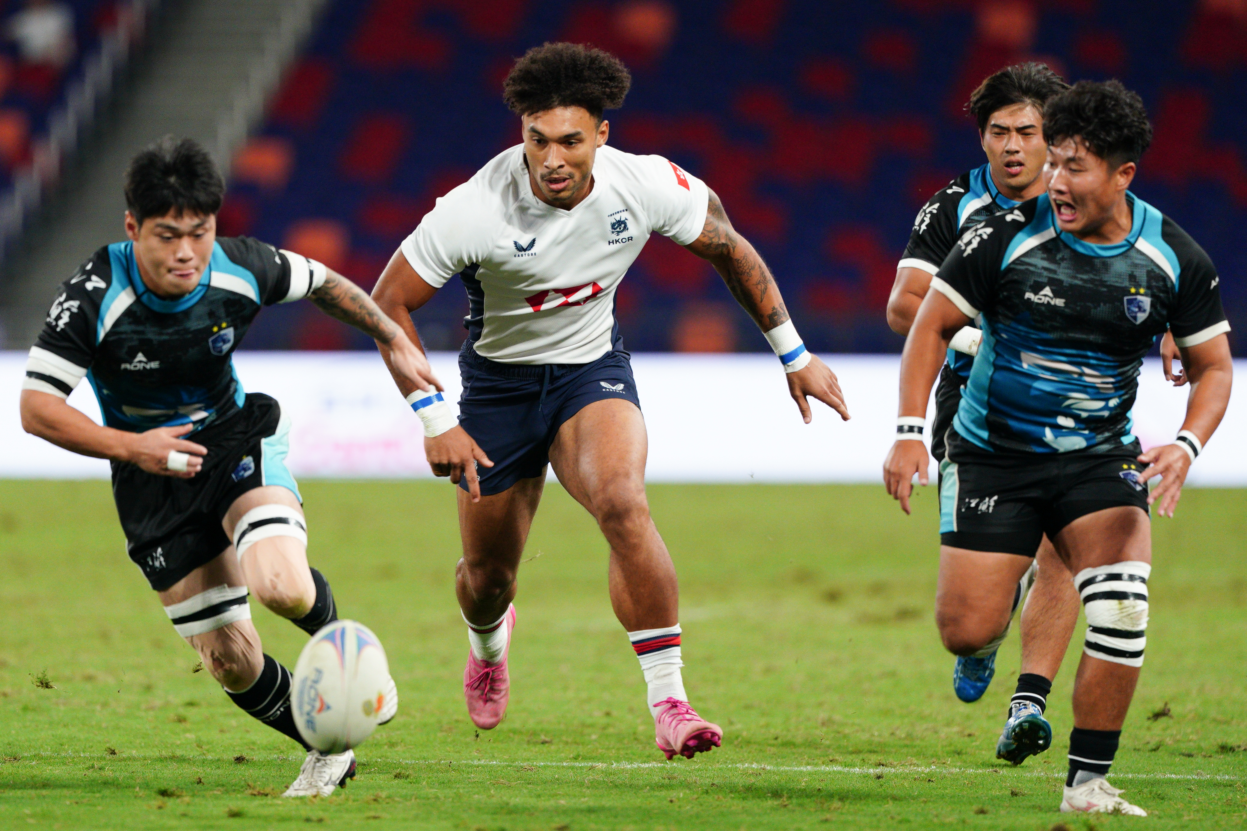 上半場開場2分鐘,香港隊5號球員SAYERS HARRY JOHN JAMES率先達陣,9號球員拜恩菲立斯追加射門成功,為隊伍先得7分,隨後12號球員房傑鋒和13號球員靴貝特亦成功達陣,幫助港隊將比分差距拉大,在拜恩菲立斯再次追加射門得分後,香港隊以21∶0大比分領先江蘇隊。而江蘇隊21號球員王桂勇在上半場最後時刻達陣成功,為江蘇隊追回5分。上半場結束,香港隊對江蘇隊比分為21∶5。