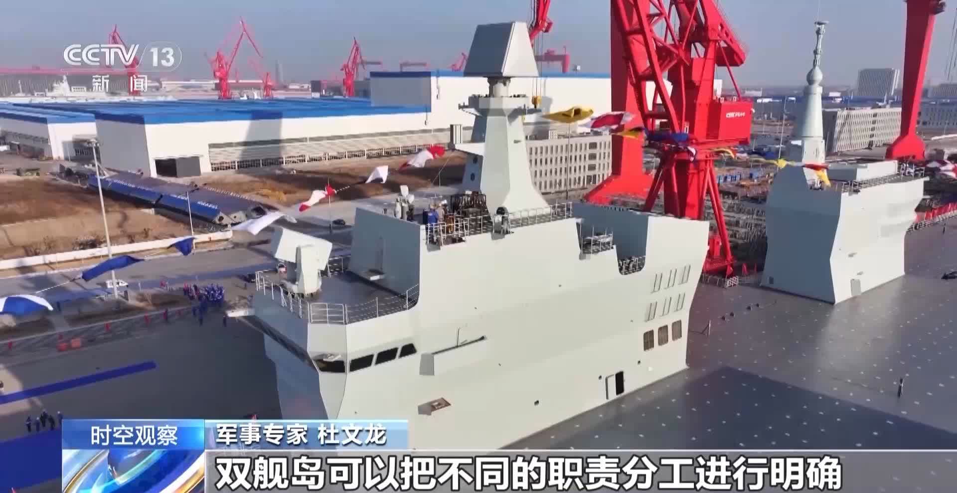 杜文龍表示,076型兩棲攻擊艦不僅可以攜帶重型戰鬥艦載機完成作戰任務,還可以通過電磁彈射多種戰鬥型的無人機完成作戰任務。所以從艦載機的種類、規模,包括出動強度和作戰任務去分析,和準航母大致相同。