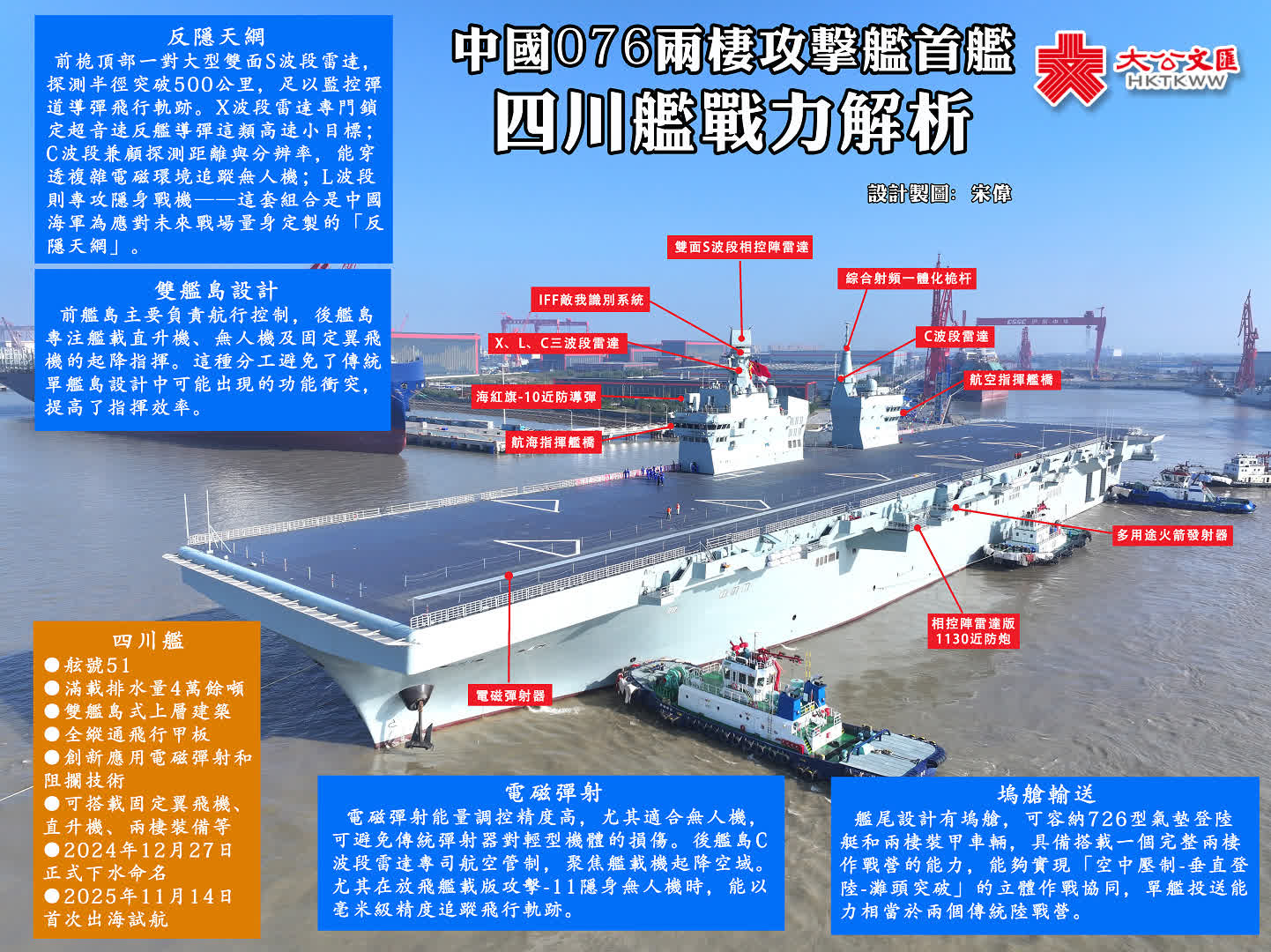 綜合新華社、央視報道,14日9時許,我國076兩棲攻擊艦首艦四川艦從上海滬東中華造船廠碼頭解纜啟航,赴相關海域開展首次航行試驗任務。四川艦由我國自主研製建造,創新應用電磁彈射和阻攔技術,滿載排水量達4萬多噸,可搭載固定翼飛機、直升機、兩棲裝備等。軍事專家表示,四川艦可變身全球首艘彈射型「無人機航母」,有效提升打擊範圍和打擊效果。