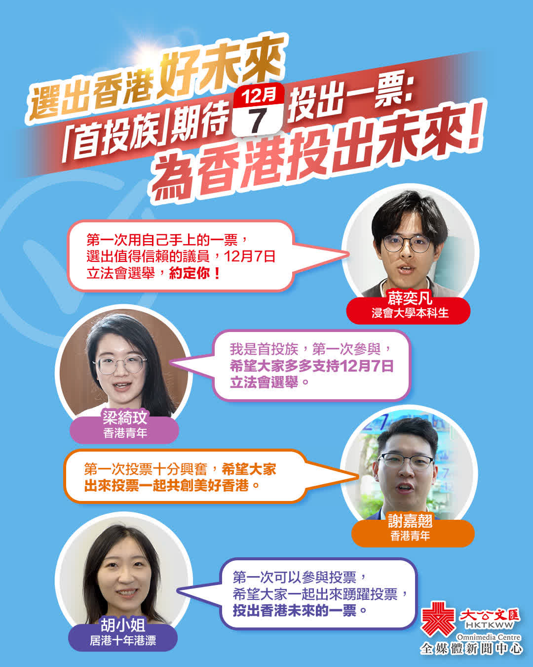 大公文匯全媒體報道,香港第八屆立法會選舉定於12月7日舉行,多位今年首次成為選民並即將履行公民責任的「首投族」,面對人生的第一次投票,他們或興奮、或緊張,或期待,但他們更希望能用手中的一票,為香港投出未來。
