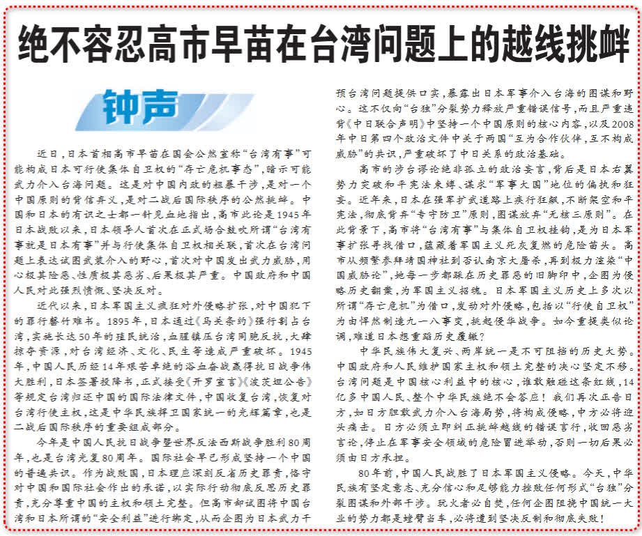 14日,人民日報刊登「鐘聲」評論文章《絕不容忍高市早苗在台灣問題上的越線挑釁》指出,高市從頻繁參拜靖國神社到否認南京大屠殺,再到極力渲染「中國威脅論」,她每一步都踩在歷史罪惡的舊腳印中,企圖為侵略歷史翻案,為軍國主義招魂。