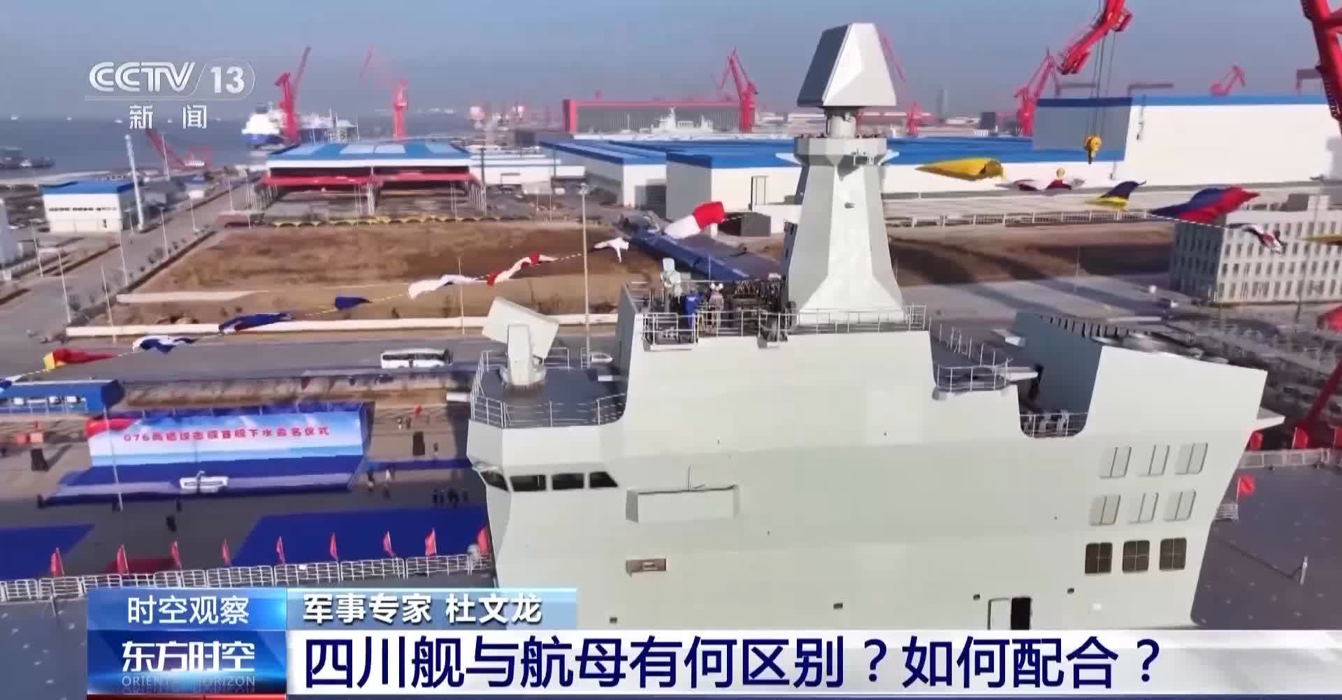 軍事專家杜文龍:076型兩棲攻擊艦不僅可以攜帶重型戰鬥艦載機完成作戰任務,還可以通過電磁彈射多種戰鬥型的無人機完成作戰任務。所以從艦載機的種類、規模,包括出動強度和作戰任務去分析,和準航母大致相同。