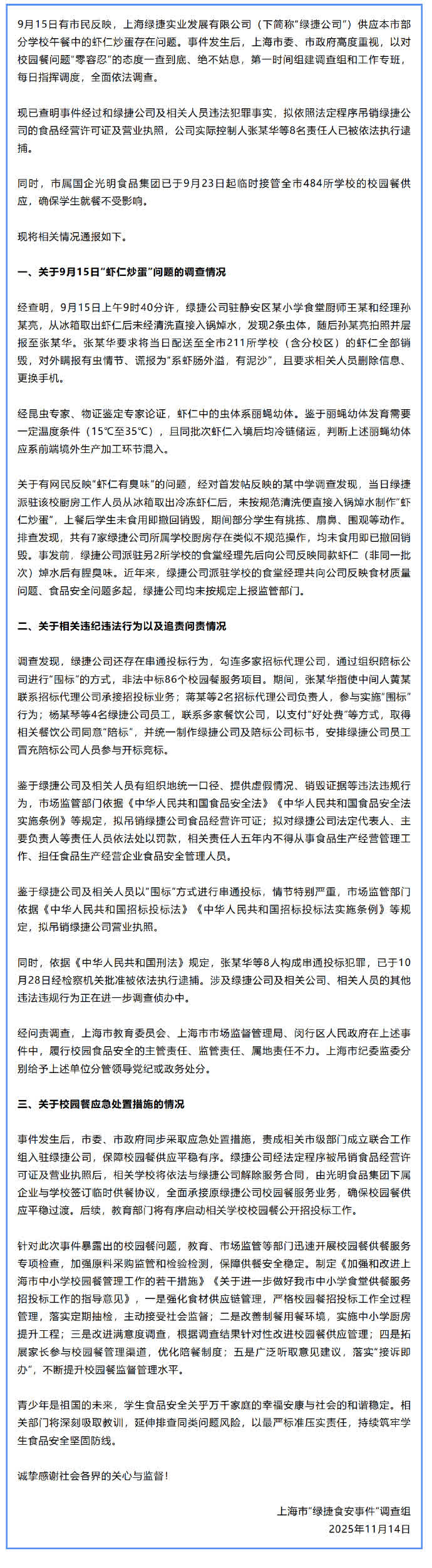 據央視新聞報道,11月14日,上海市「綠捷食安事件」調查組發布情況通報。通報內容如下: