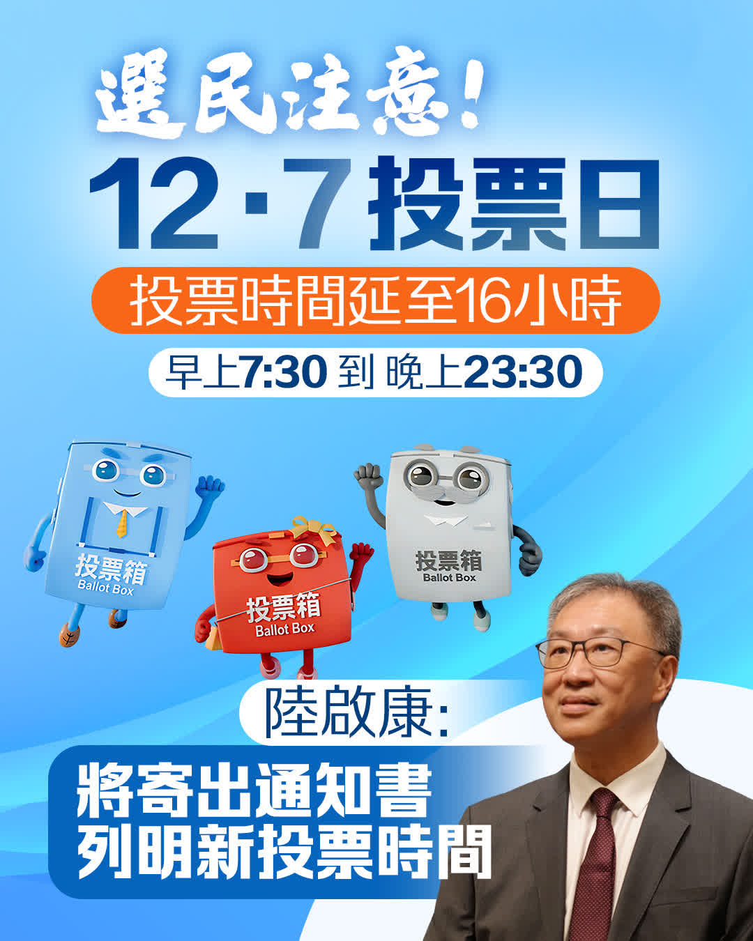 陸啟康續指,為方便不同選民,12月7日投票日將延長投票時間至共16小時,由早晨7:30至晚上23:30,並向全體選民寄出通知書,列明最新投票時間。