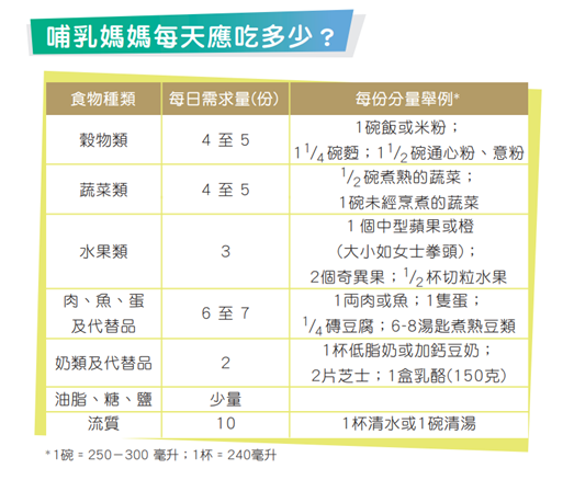 哺乳期間,媽媽應保持均衡飲食,每天吃多樣化食物,包括穀物、蔬菜、水果、肉類、魚類、蛋類及奶製品,同時選擇全穀類如糙米、麥皮、全麥麪包等;適量進食並輪流選擇不同類型的魚類,以攝取奧米加-3脂肪酸。媽媽亦應避免進食體型較大的捕獵魚類及甲基汞含量較高的魚類,以免甲基汞對寶寶發育造成不良影響。此外,媽媽也應多吃蔬菜和水果,減少進食高脂肪、含反式脂肪或高糖食物;烹調時去肥去油,保持飲食清淡健康。