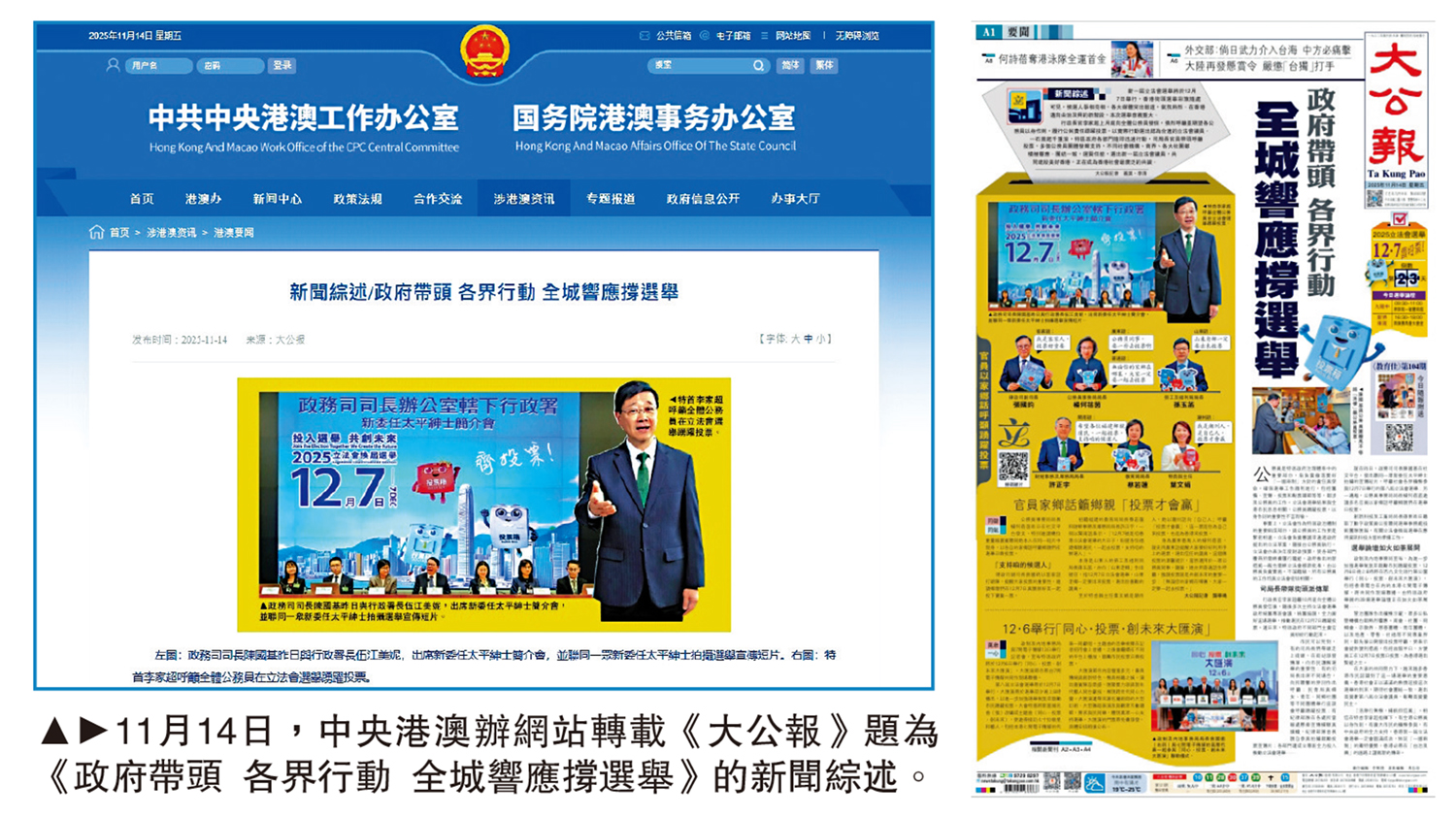 (大公報記者 李清)11月14日,中央港澳工作辦公室、國務院港澳事務辦公室網站轉載《大公報》題為《政府帶頭 各界行動 全城響應撐選舉》的新聞綜述。文章表示,新一屆立法會選舉將於12月7日舉行,在香港邁向由治及興的新階段,本次選舉意義重大,連日來特區政府官員紛紛發聲,呼籲合資格選民積極投票,越來越多香港市民認識到了這一場選舉的重要意義。