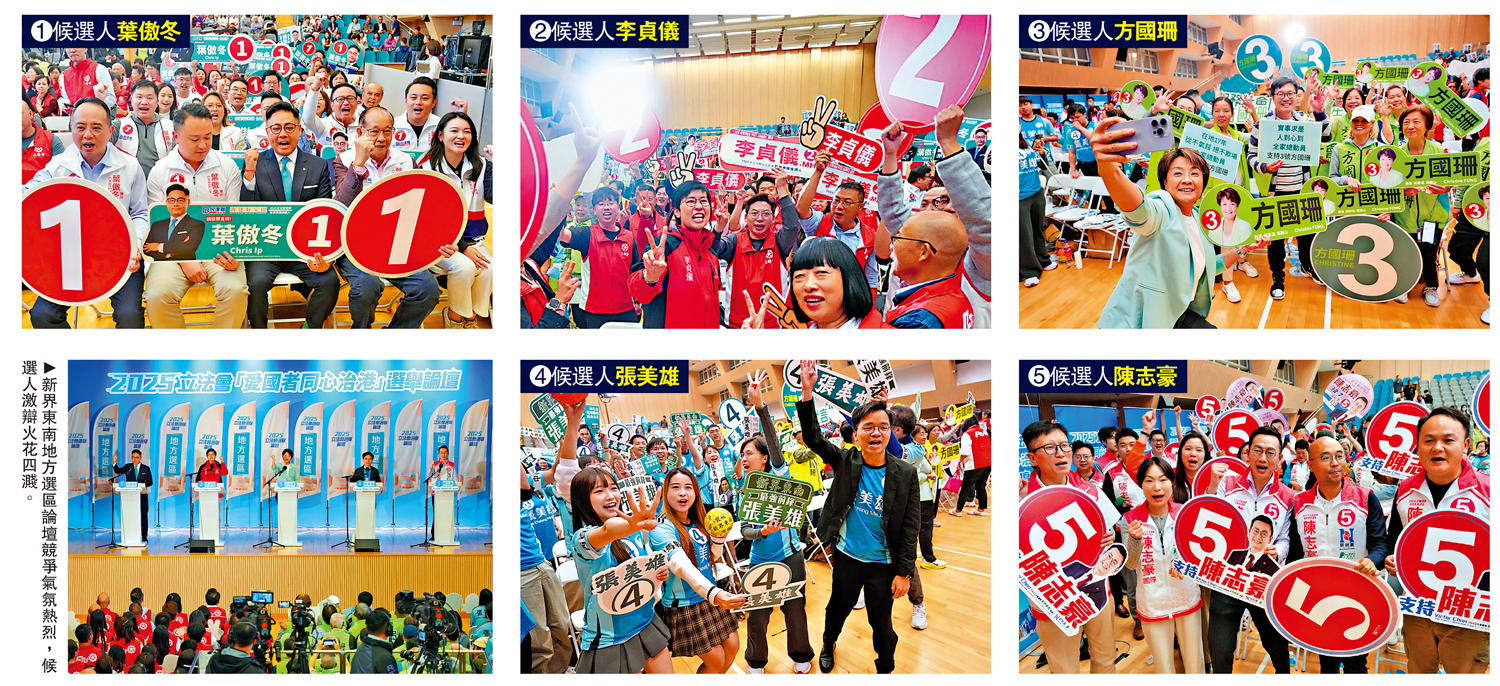 (大公報記者 黃釔淼)昨日下午,西貢賽馬會大會堂人頭湧湧。五位新界東南地方選區的候選人,都曾擔任區議員,但無一人是現任立法會議員。1號葉傲冬、2號李貞儀、3號方國珊、4號張美雄、5號陳志豪在「新界東南地方選區論壇」上熱烈表達自己政見、政綱,向市民展現自己對地區事務和社會議題的「熟書」。