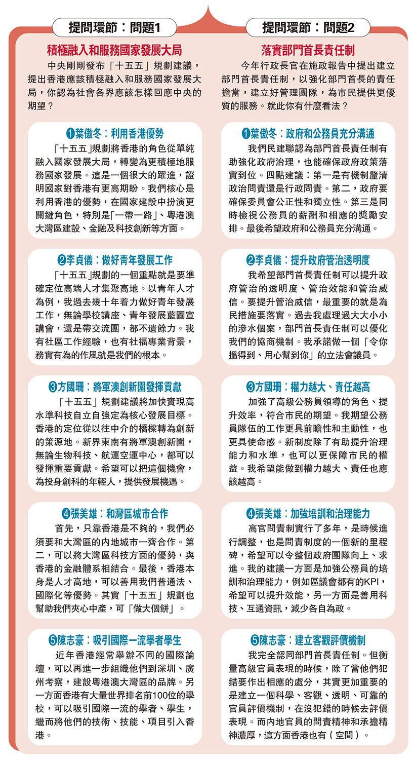 問題1:中央剛剛發布「十五五」規劃建議,提出香港應該積極融入和服務國家發展大局,你認為社會各界應該怎樣回應中央的期望?