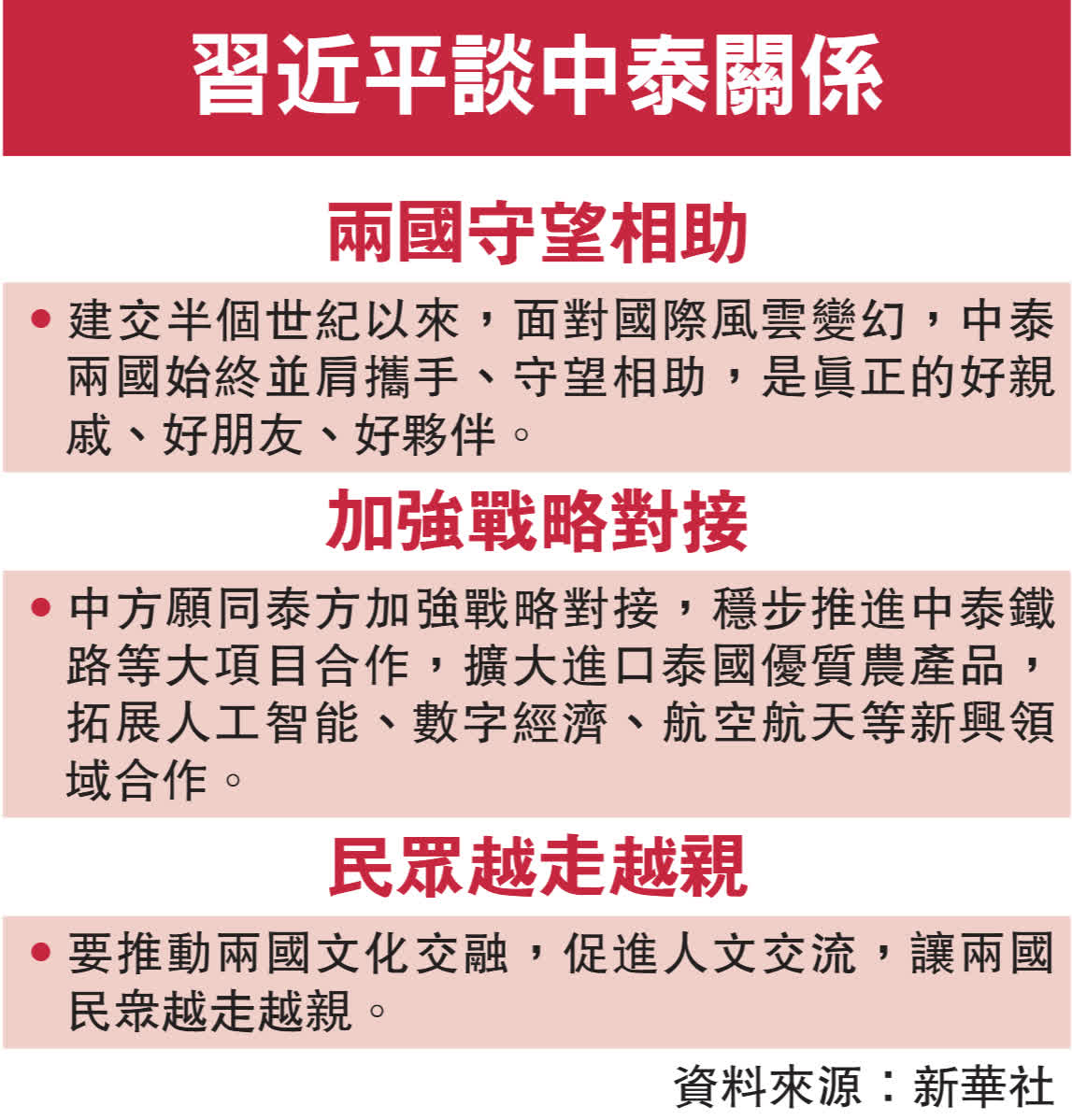 習近平指出,中共二十屆四中全會審議通過「十五五」規劃建議,將聚焦推動高質量發展,擴大高水平開放。泰國也處在國家發展振興的關鍵階段。中方願同泰方加強戰略對接,穩步推進中泰鐵路等大項目合作。