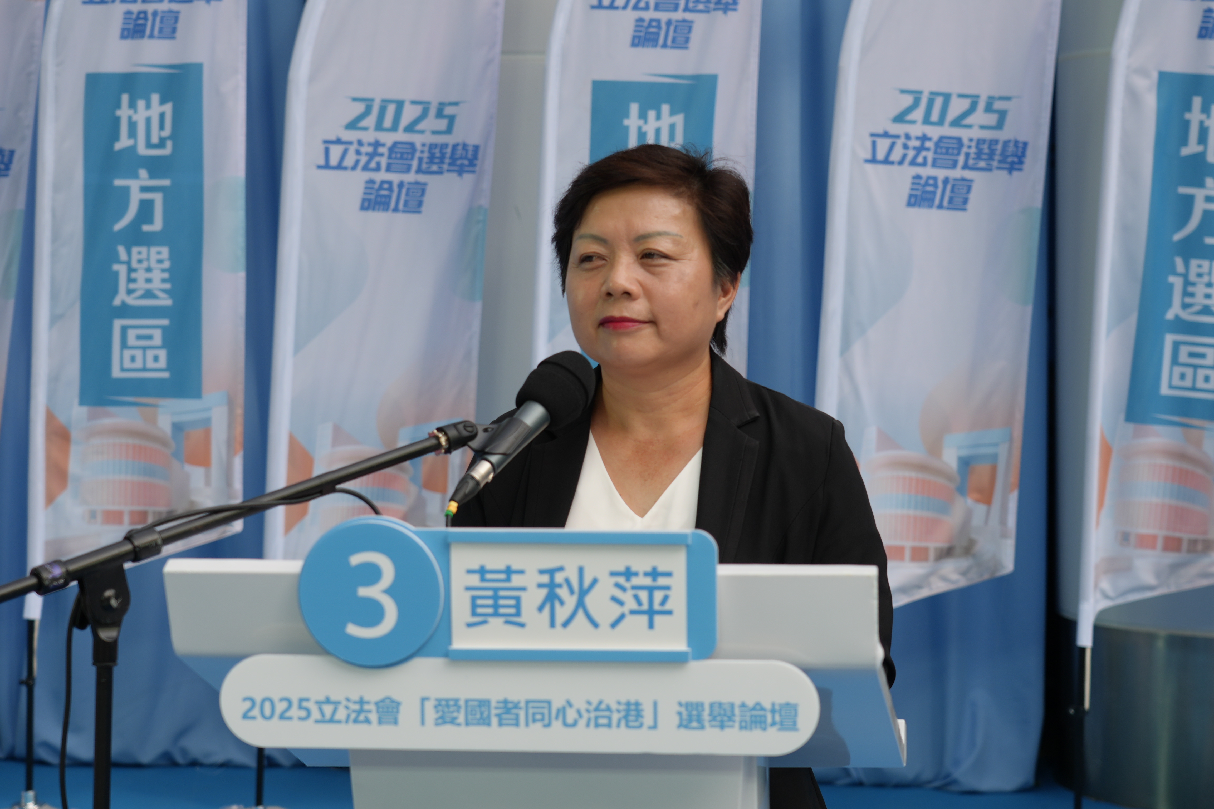 3號候選人離島區議員黃秋萍,報稱無政治聯繫。她表示,過去6年感謝大家支持,自從擔任離島區議會交通運輸委員會主席,更了解區內民生需求,致力解決單車泊位難、交通堵塞等痛點,為市民做實事。黃秋萍介紹自己的參政理念,包括完善交通基建,爭取興建大嶼山環島公路,關注南港島綫西段進度,爭取重推租置計劃,並致力保障婦女權益,如爭取將三八婦女節納入香港法定假日等。