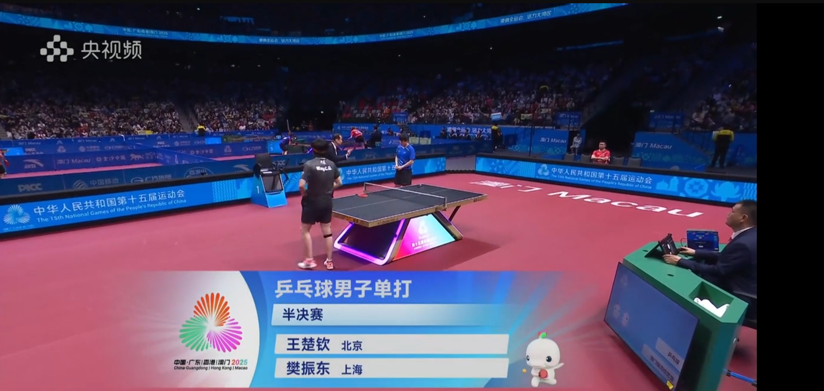 大公文匯全媒體報道,十五運會賽程過半,乒乓球單打半決賽今天(15日)開賽。中午12時30分,男單半決賽拉開序幕,王楚欽與樊振東作為巴黎奧運會男團比賽的金牌戰友,上演巔峰對決。現場氣氛十分火熱,歡呼聲此起彼伏。