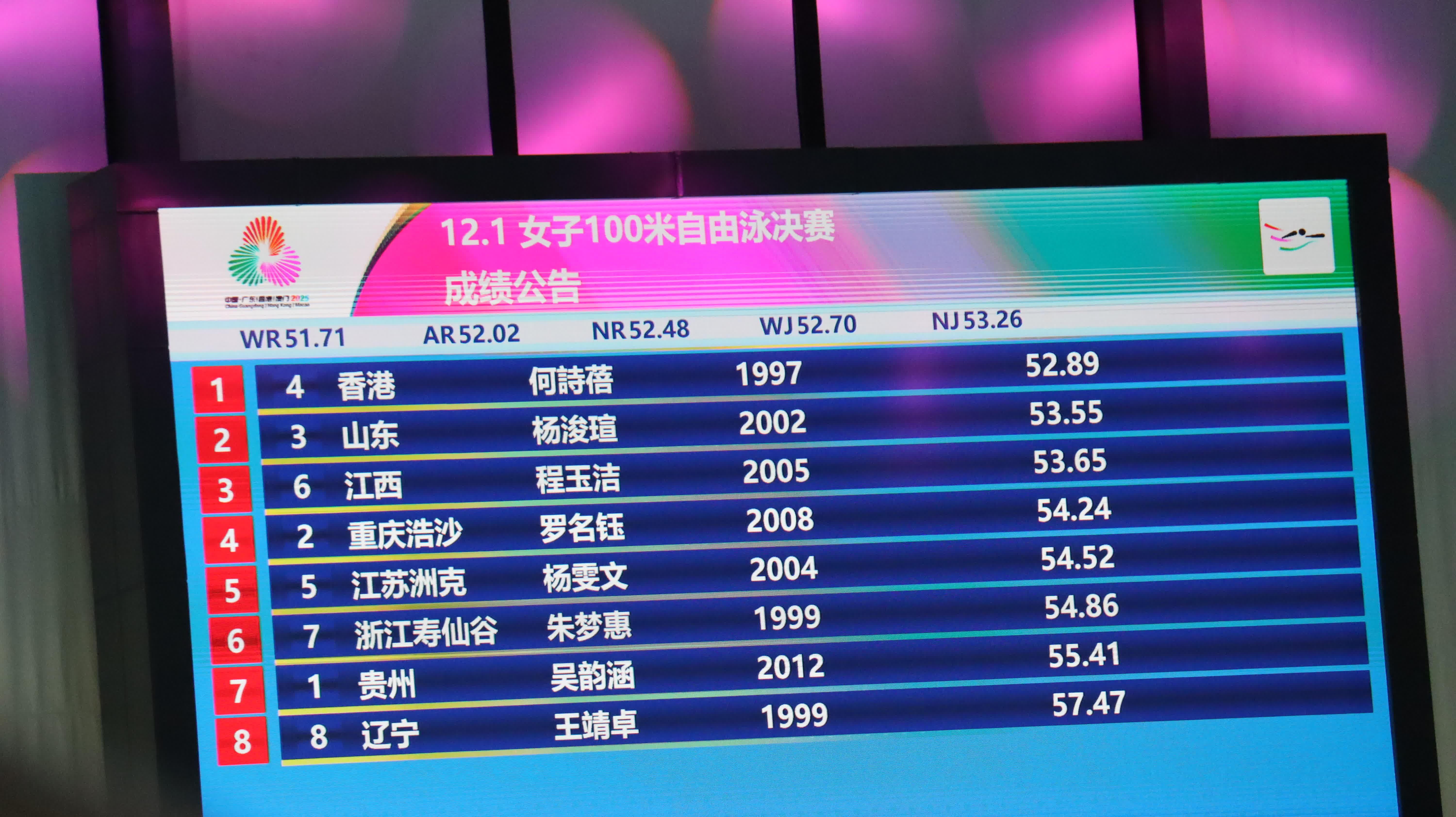 山東隊楊浚瑄以53.55秒獲得銀牌,江西選手程玉潔以53.65秒位列第三。