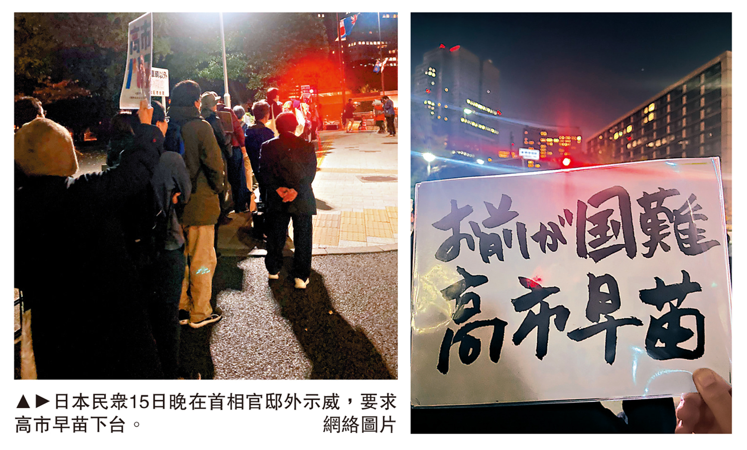 大公報綜合報道,高市早苗日前在國會公然發表關於中國大陸對台灣動武,可能構成日本「存亡危機事態」的露骨挑釁言論。高市就任首相一職還不到一個月,就已經在台灣問題上多次挑戰中國這一核心利益中的核心,粗暴干涉中國內政,嚴重違背國際法和國際關係基本準則,嚴重破壞戰後國際秩序。高市錯誤言論在日本國內引發軒然大波,引起日本國內各界狠批。日本民眾15日晚在首相官邸外示威,要求高市早苗下台。