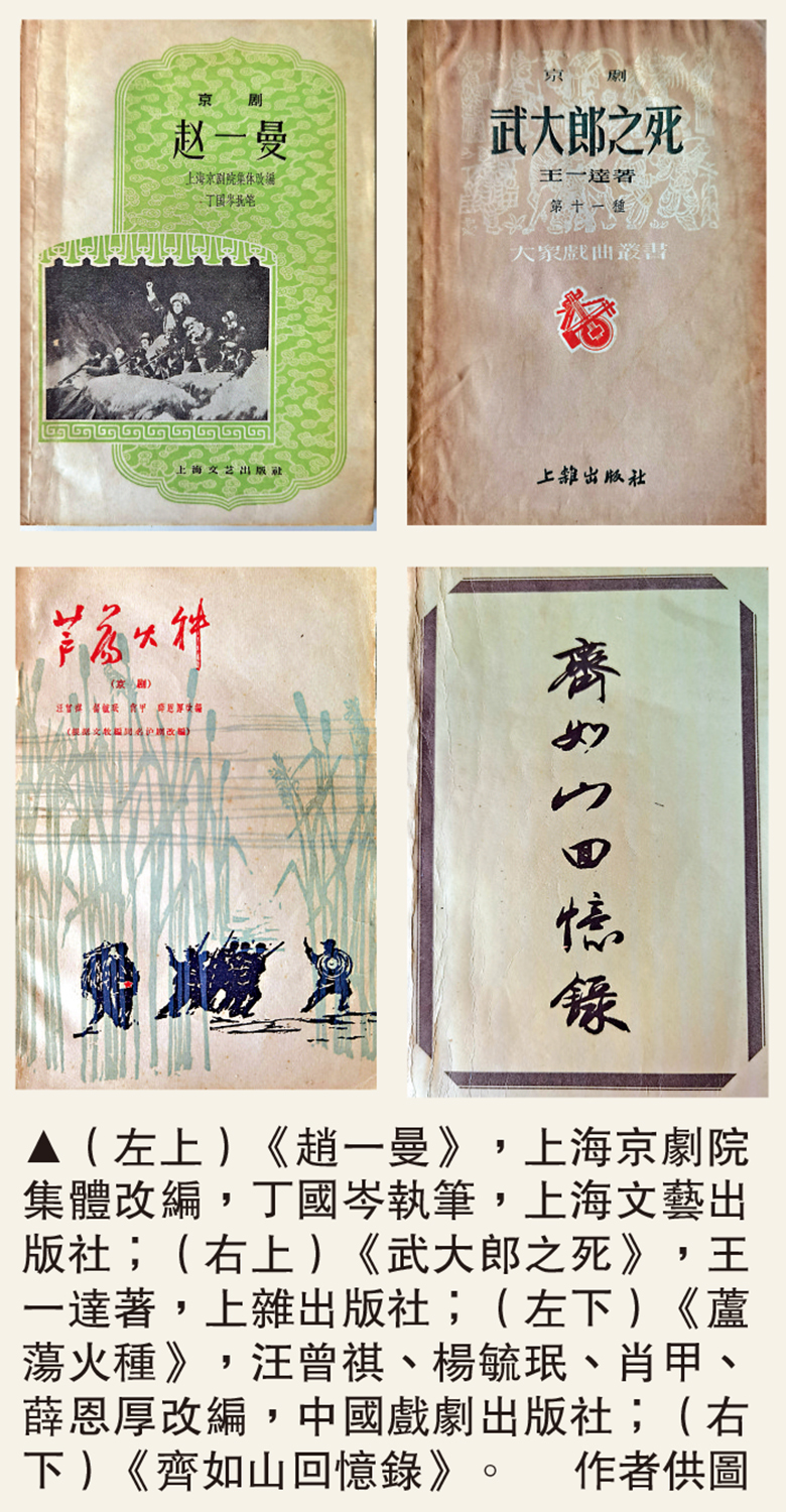 我淘來的京劇舊書不如話劇書多,但各有特色。比如一九五九年由上海文藝出版社出版的京劇《趙一曼》(上海京劇院集體改編,丁國岑執筆),主演是荀派名家童芷苓,還有在《智取威虎山》中扮演楊子榮的武生童祥苓和扮演欒平的名丑孫正陽,也都在《趙一曼》中擔任重要角色。戲雖然從舞台上消失了,可劇照卻歷歷分明地印在書裏,多少可以滿足我「照本看戲」需求。還有一個舊本子是王一達編劇的《武大郎之死》,這是由馬彥祥主編的「大眾戲曲叢書」之一種,由上雜出版社於一九五一年初版,我淘得的這本則是一九五三年的第三版。只可惜這個版本沒有附上演出劇照,只能靠想像照本讀劇了。不過,讀戲曲劇本與讀話劇劇本有一個明顯的區別,就是裏邊有很多段落是帶韻的。京劇的唱詞一般都比較雅緻,有古典詩詞的韻味又不是格律詩,有新詩的節奏也並非白話詩,是一種特殊的韻文。還有些念白,像是打油詩,也像大白話,風趣幽默,很接地氣。比如該劇第二十四場,寫武松原本想為武大郎申冤,去衙門告狀,結果縣太爺不但不接狀子,還打了武松四十大板。此時武松有一段念白:「贓官哪!不准俺的狀,重責哄下堂,一心袒護西門慶,看來定是貪了贓……公道全不講,王法丟一旁,可恨贓官受了賄呀,他、他、他不與俺作主張!」讀着這樣的句子,你似乎可以「聽到」那有板有眼的念白,激憤而鏗鏘──這不啻是「照本看戲」的獨特魅力。