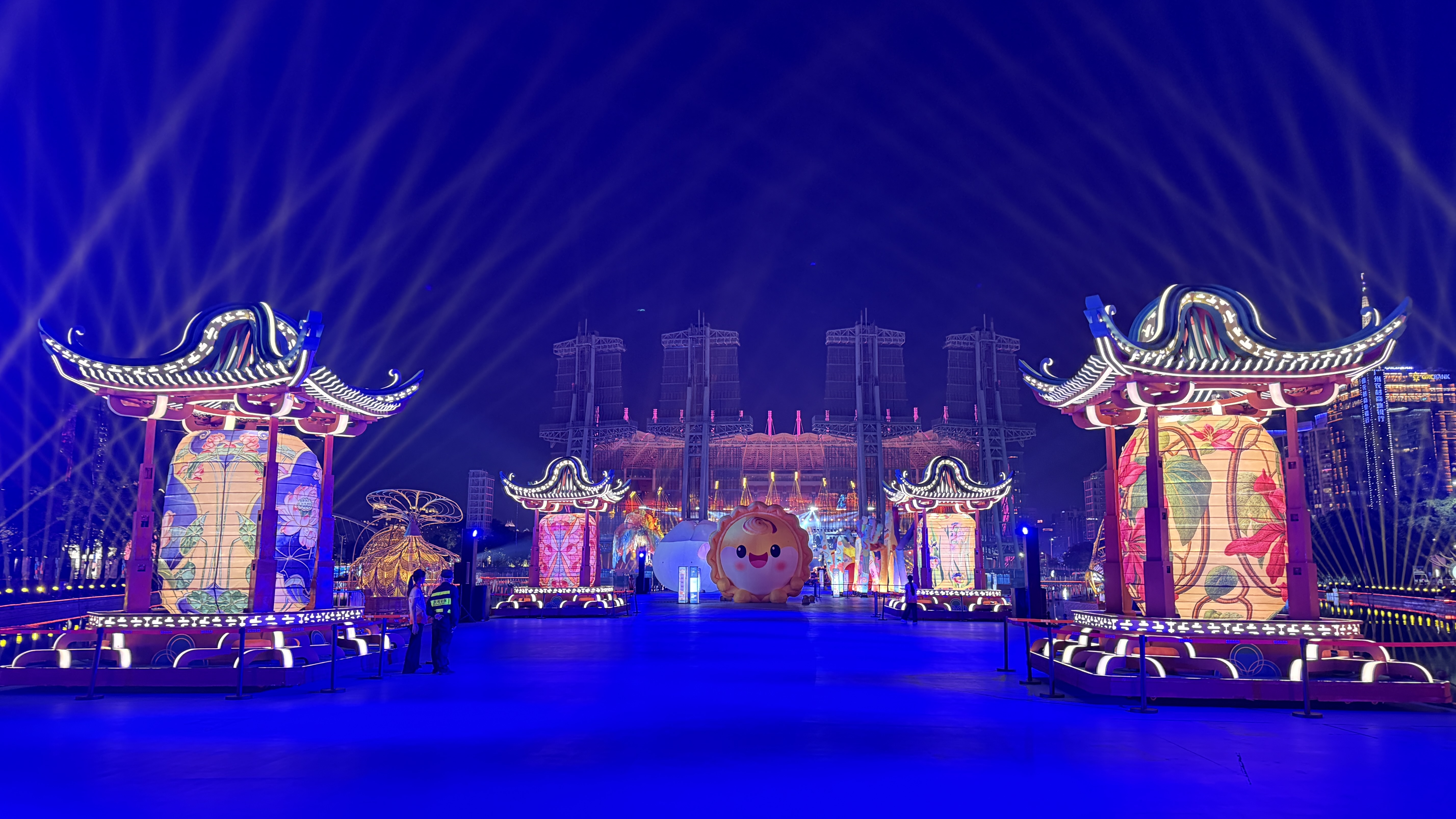 開幕式上與詠春表演相互輝映的懸浮芭蕉葉,此次也以燈光藝術裝置《蕉雨水色》的形式,落戶於燈光節星光大道展區。嬌艷欲滴的顏色,與璀璨的雙塔夜景、粼粼江波和城市背景音樂相融,為廣州的夜色添上一筆優雅而靜謐的嶺南詩意。而開幕式上承載嶺南建築美學精髓的亭台裝置,也以《月秀亭閣》之名在燈光節中 「駐留」,成為別具特色 的「常駐嘉賓」。幾大裝置延續了開幕式的嶺南文化脈絡,讓燈光節成為沉浸式感受羊城人文與美學的絕佳載體。