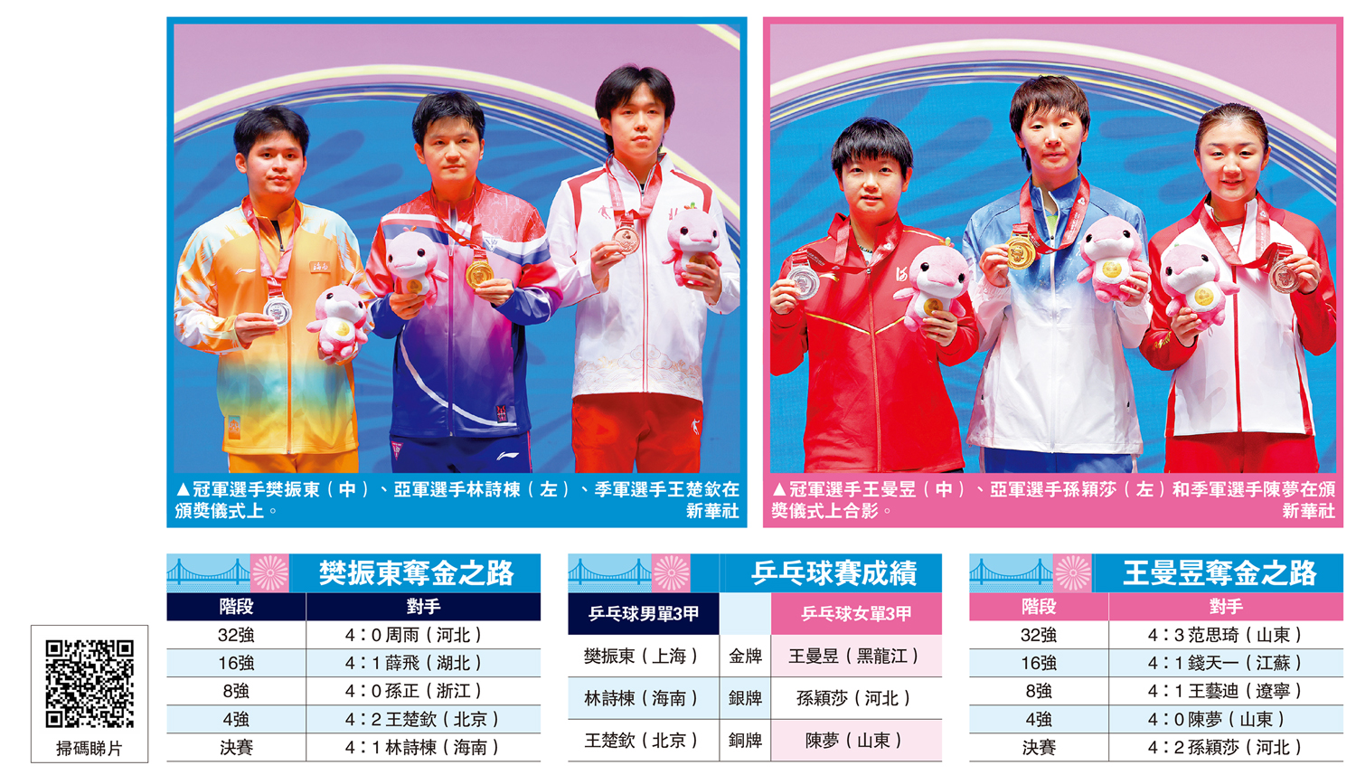 女單賽事,「世一」球手孫穎莎在決賽中對陣世界第二的王曼昱。首局,孫穎莎以11:7先下一城,隨後王曼昱以11:8、12:10及11:4連贏3局,孫穎莎背水一戰下,在第5局以16:14獲勝,但王曼昱頂住壓力,最終以11:9、大比分4:2衛冕女單金牌。至於銅牌戰,山東隊球手陳夢以局數3:1輕取澳門隊的朱雨玲奪牌。