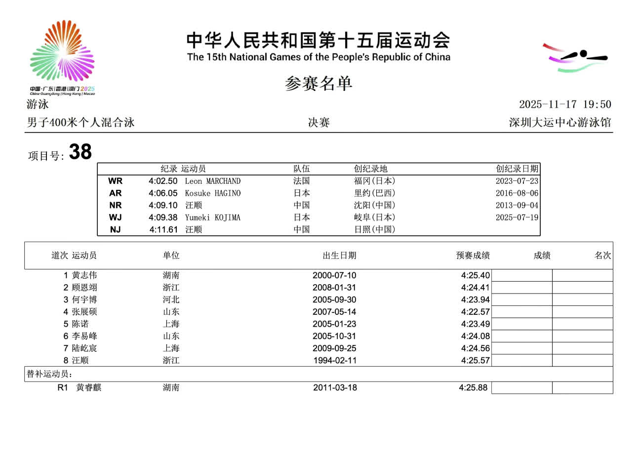 目前,男子400米個人混合泳的全國青年紀錄為4:11.61,全國紀錄為4分09秒10。張展碩在該項目的報名成績為4:11.86,距離汪順的全國青年紀錄僅有0.25秒之差。在今晚決賽中,如果他發揮出色,衝擊全國青年紀錄的可能性極大,若他能在其他三種泳姿階段保持速度與良好的體力狀態,為最後的自由泳實現衝刺爆發,突破汪順保持的全國紀錄也並非是天方夜譚。