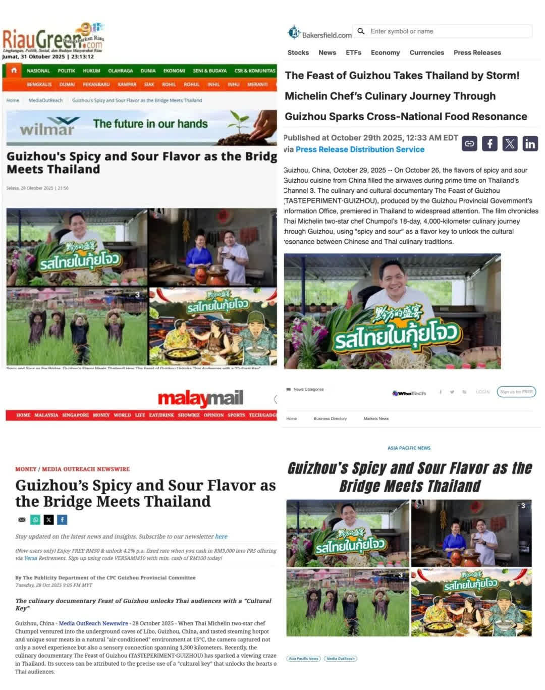 新加坡媒體Channel News Asia稱紀錄片以美食為媒展現貴州多元文化,為跨國文化交流提供借鑒案例;馬來西亞媒體MY Sinchew聚焦「酸辣」味覺紐帶,提及Chef Chumpol融合兩地飲食智慧;菲律賓媒體The Manila Times關注片中「酸辣」味覺共鳴與貴泰美食融合呈現;印度主流英文日報The Hans India提到該紀錄片的呈現方式,生動詮釋了美食作為文明對話載體的獨特價值。