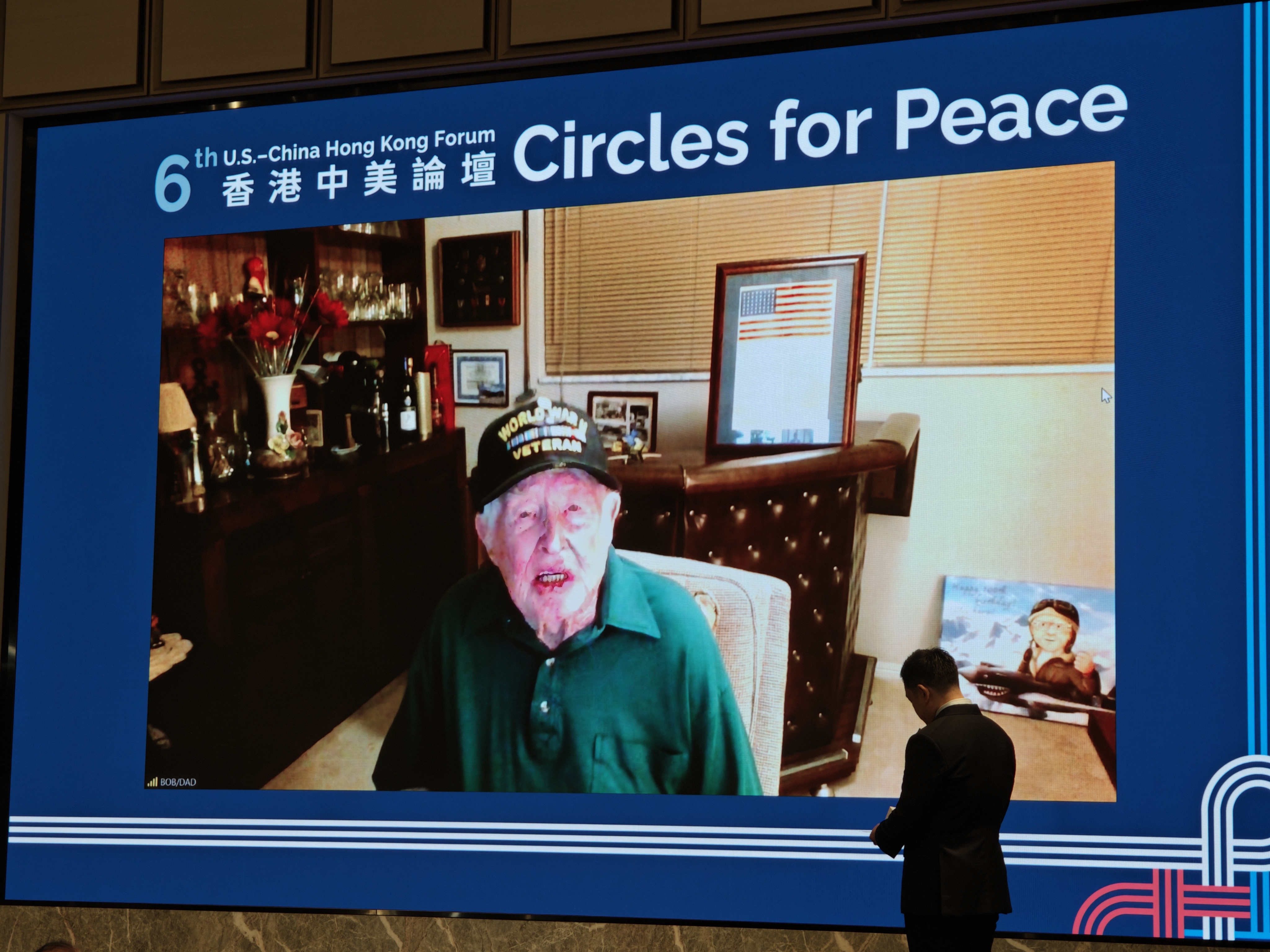論壇以「共築和平之環」主題開場,在現場視頻連線了已經101歲的飛虎隊老兵Robert Moore。Moore回憶,在他執行的96次飛行任務中,「團隊的作用無可替代」,運送物資的飛機引擎還未熄滅,他的中國戰友已在全力卸貨。如今世界存在着海平面上升、洪水等災害,他強調團隊作用無可替代,「相比單個國家,團隊協作能更有效地應對這些挑戰」。