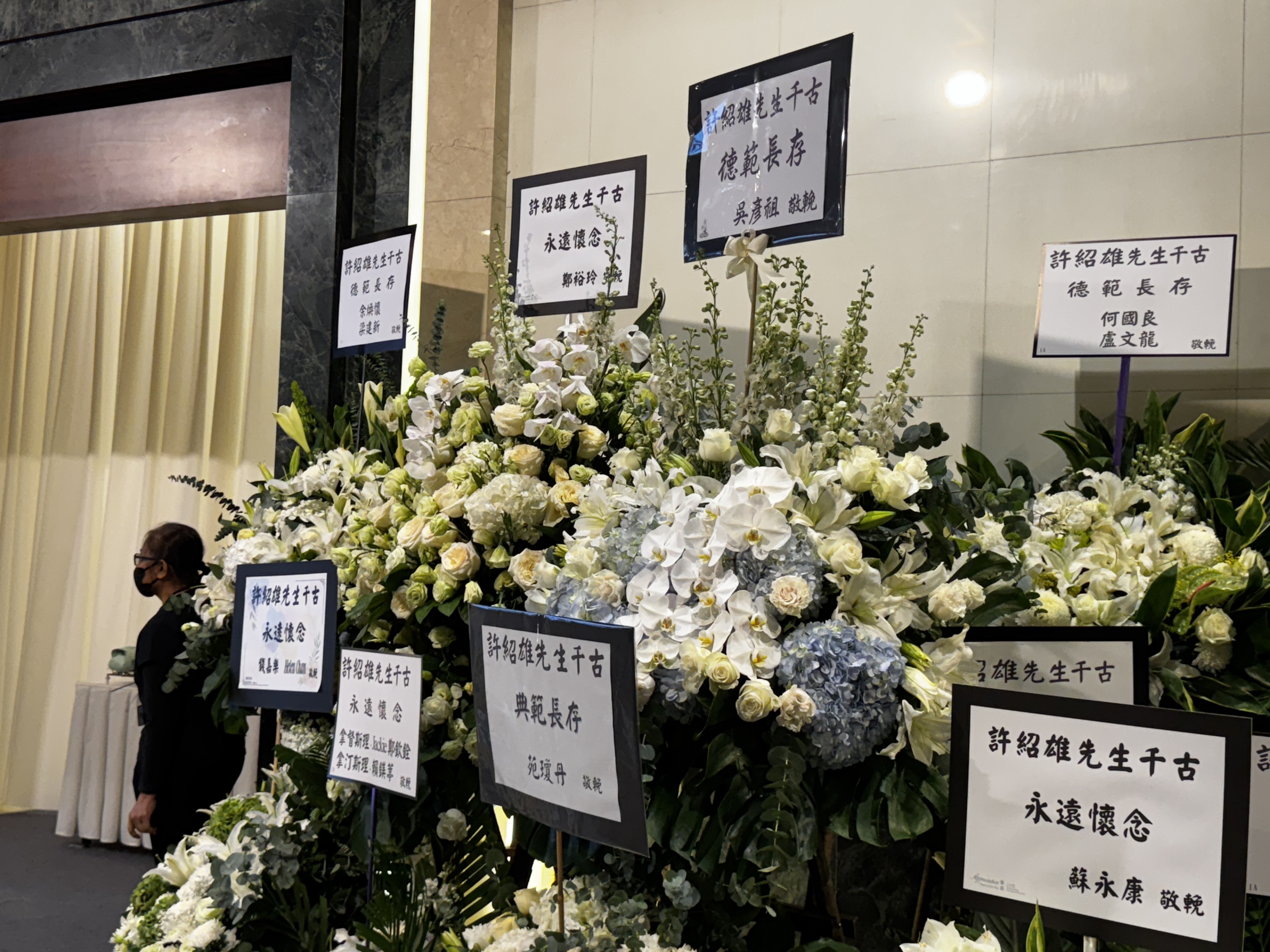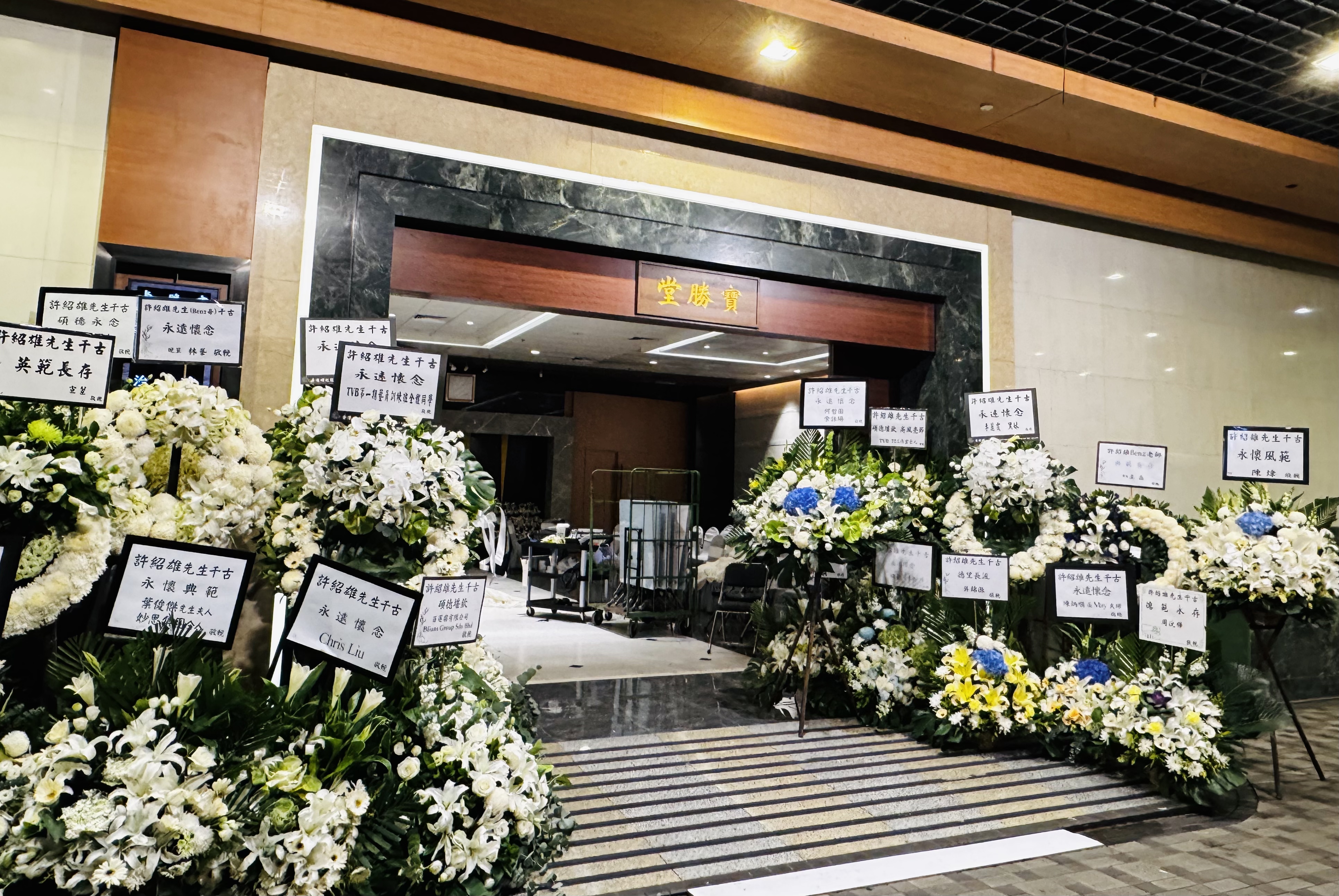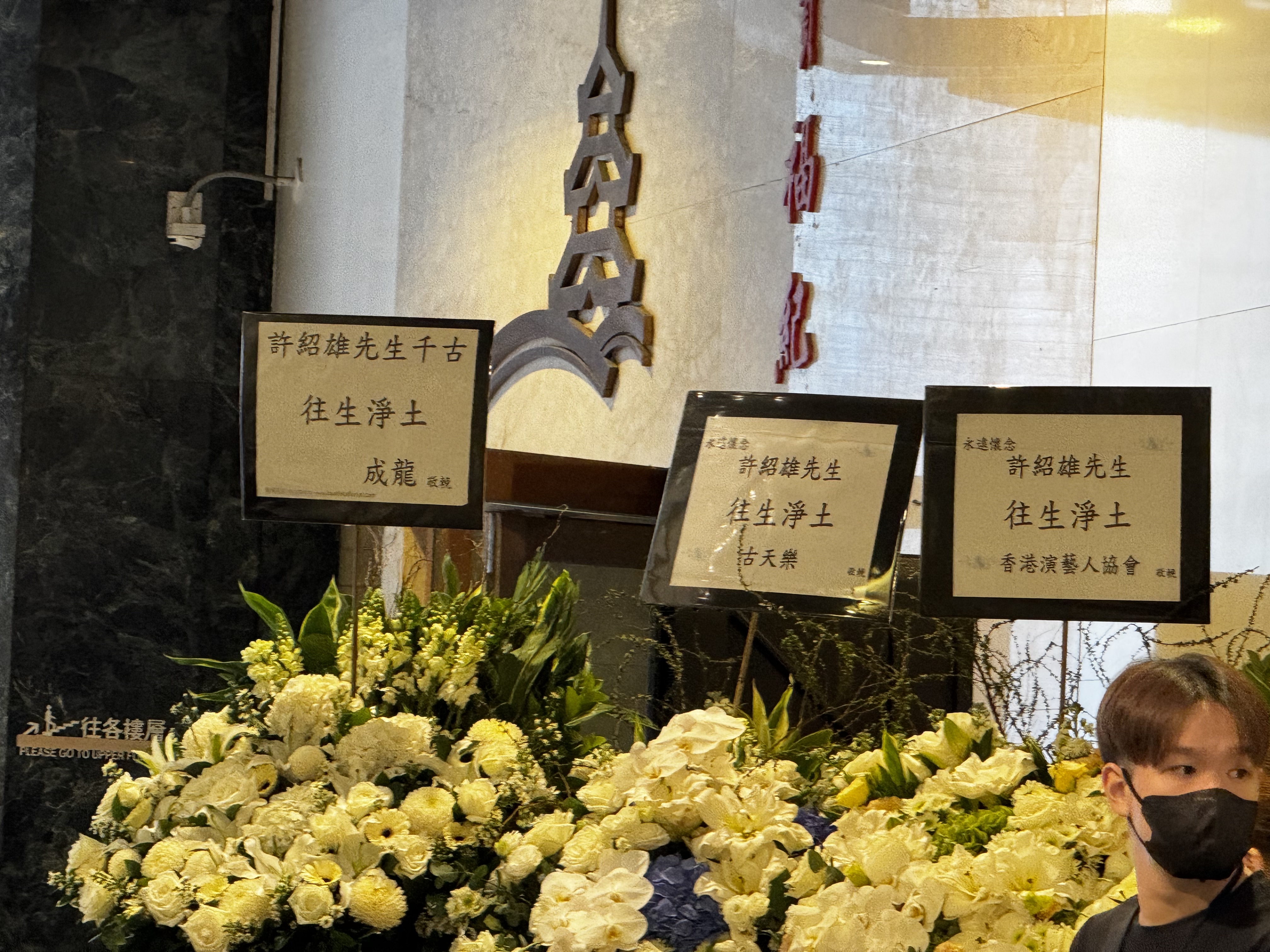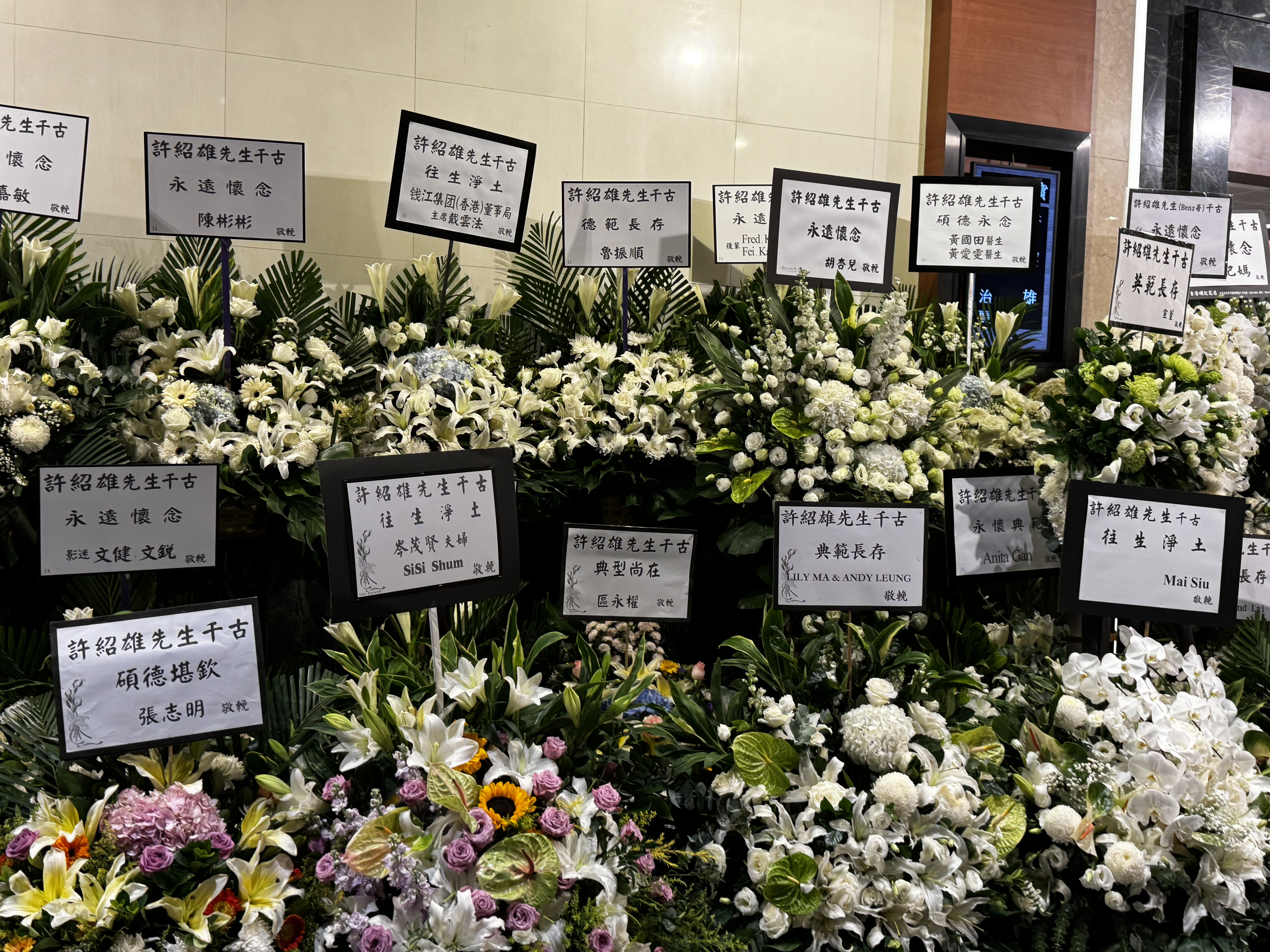 今日下午可見,靈堂外空間已經猶如花海,不少圈中好友送上花牌,包括成龍、古天樂、任達華、鄭裕玲、吳彥祖、苑瓊丹、余安安、胡杏兒、林峯、宣萱、錢嘉樂、蘇永康等等,表達深厚情誼與無盡懷念。