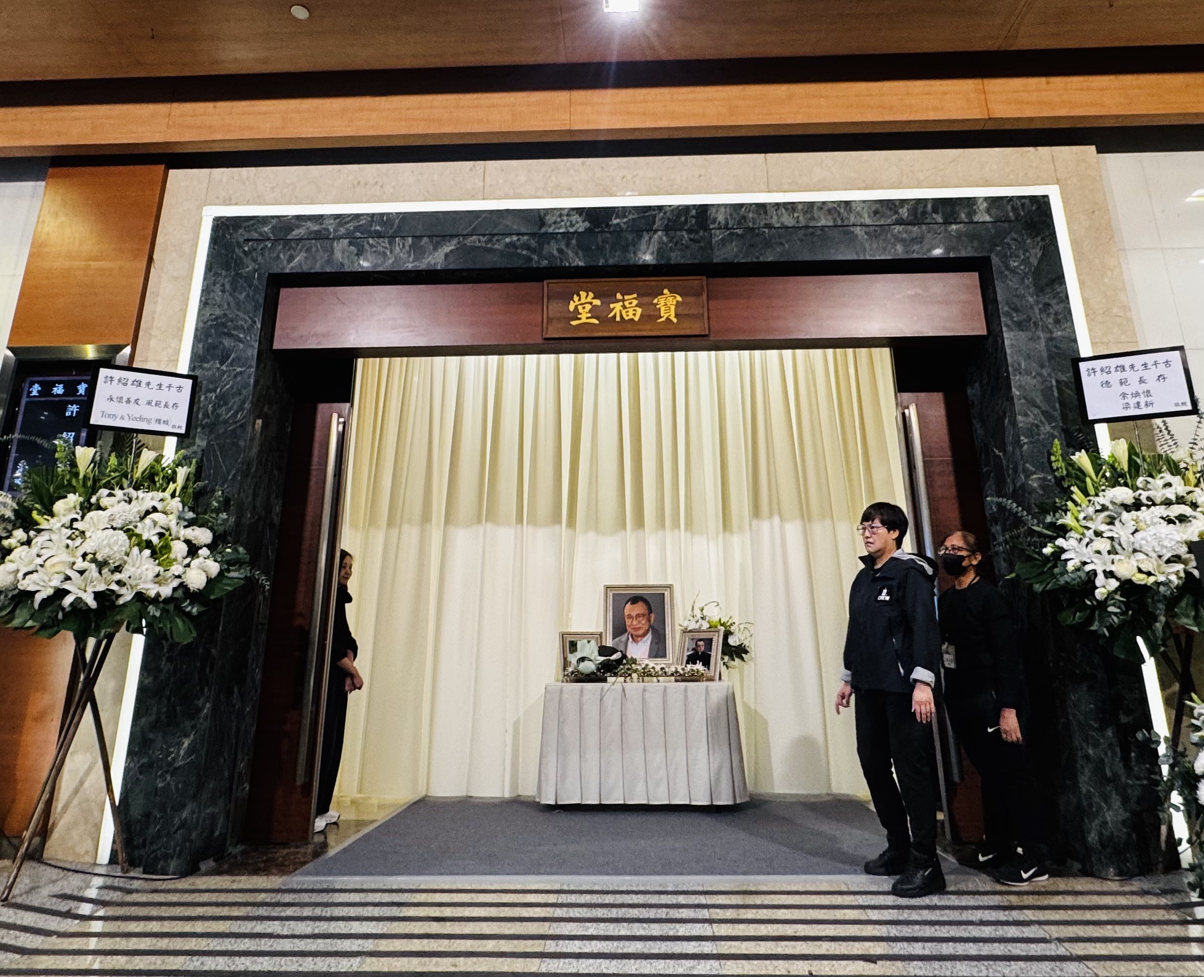 許紹雄愛妻鳳子及子女俊貽和惠菁的心形花牌,放在靈堂正中央,契女佘詩曼的花牌也放在當眼處,並寫上:「老豆千古 永遠懷念」。許紹雄靈堂內擺放多部電視,播放許紹雄生前的影視作品、得獎畫面,以及與圈中好友的合照。