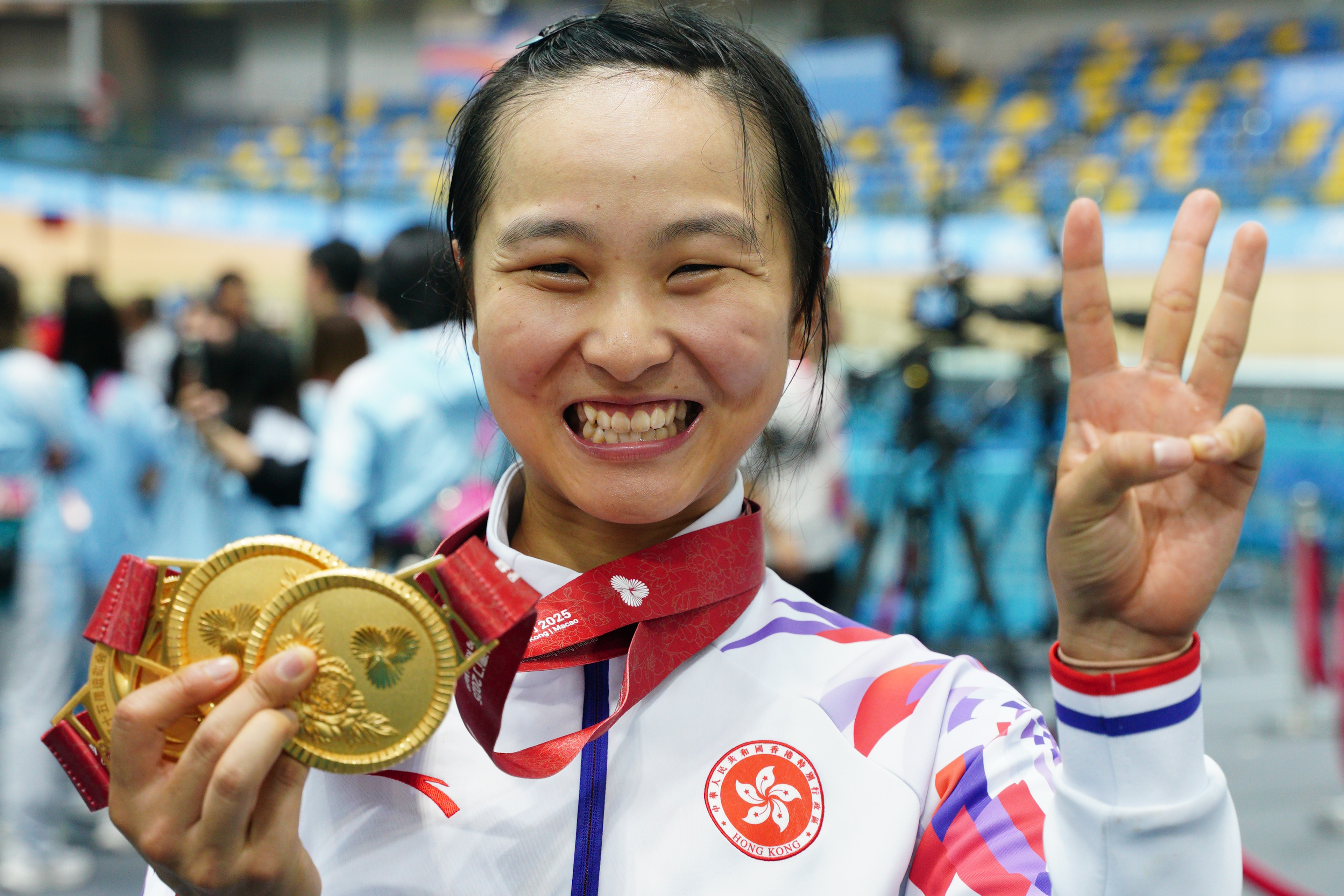 大公文匯全媒體報道,「小女車神」李思穎在手握兩金後,今日(17日)繼續出戰場地單車女子全能賽。完成全能賽四個項目後,李思穎取得總分124分,成功奪金!連同她在公路單車女子個人賽以及昨日與梁穎儀於女子場地單車麥迪遜賽取得的金牌,這是李思穎在今屆全運會取得的第三面金牌。她也超越前輩黃金寶,以4面金牌的成績,成為香港史上最多全運會金牌的運動員。