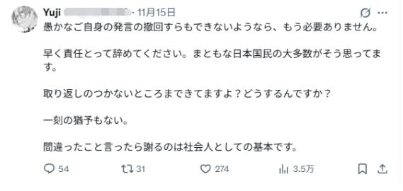 網友「Yuji」發帖稱,請高市早苗承擔責任,盡快辭職。說錯話道歉是作為社會成員的基本原則。網友「kigenyoshio」認為,如果首相在沒有得到全國共識的情況下,就擅自宣布日本對台灣進行軍事干預,那會讓事態變得很麻煩。網友「Norl Ubukata」說,在這一問題上,世界上沒有任何國家會站在日本這一邊。如果日本人不能親手讓高市下台,無法對持續庇護她的自民黨作出決斷,日本恐怕難以向國際社會作出交代。