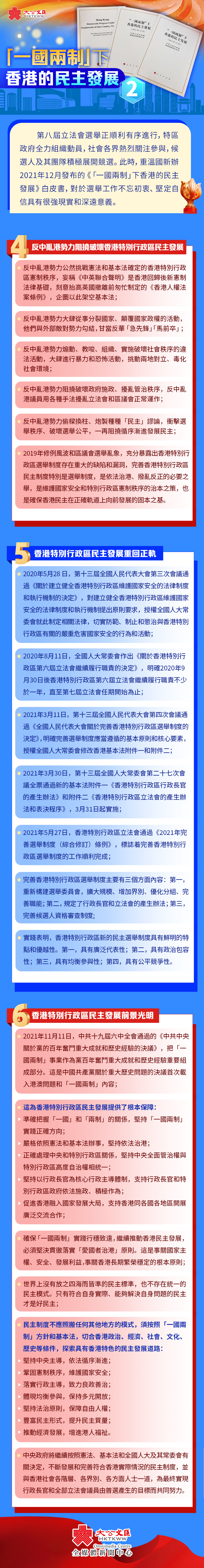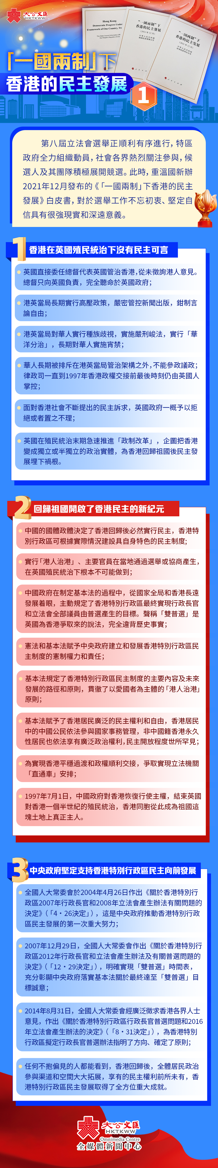 香港第八屆立法會選舉正順利有序進行,特區政府全力組織動員,社會各界熱烈關注參與,候選人及其團隊積極展開競選。在全面落實「愛國者治港」原則下,此次選舉呈現的守正傳承、創新開拓、良性競爭的生動局面,進一步彰顯新選舉制度的先進性和優越性,進一步鞏固發展符合香港實際高質量民主。在這個時候,重溫2021年12月國新辦發布的《「一國兩制」下香港的民主發展》白皮書,對於選舉工作不忘初衷、堅定自信具有很強的現實和深遠意義。大公文匯網編輯部梳理《「一國兩制」下香港的民主發展》白皮書要點如下,以饗讀者。