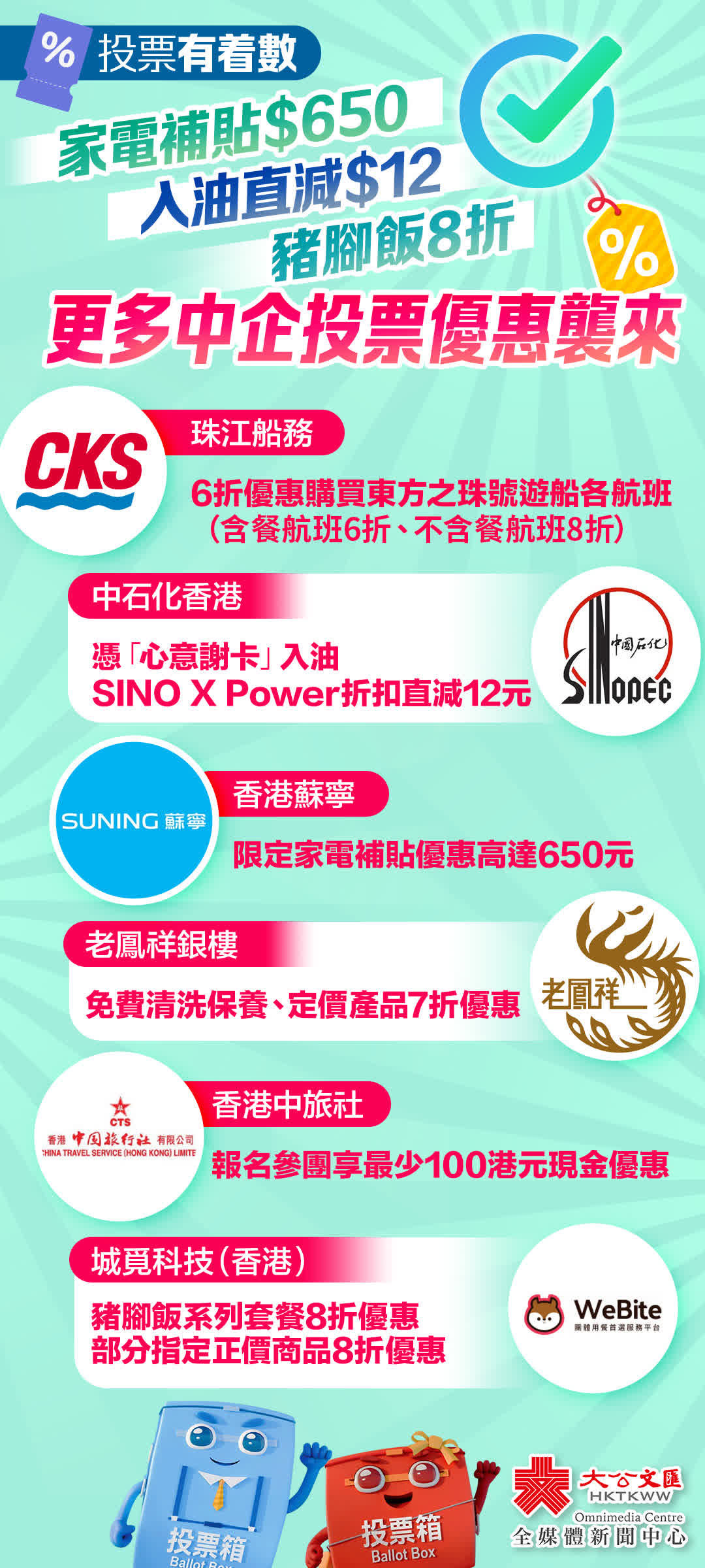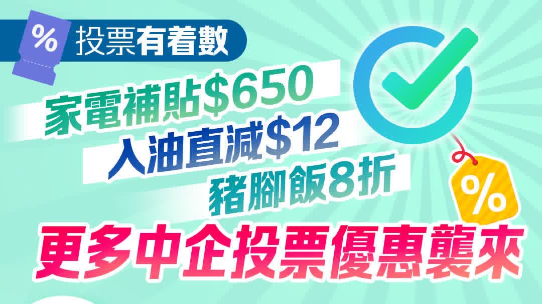 大公文匯全媒體報道,立法會換屆選舉投票日12月7日不斷臨近,香港街頭巷尾選舉氛圍日益濃厚,不少企業、社團、商家用實際行動為選舉助力。在這股熱潮中,由香港大公文匯傳媒集團發起的「投票有着數」活動獲得社會各界巨大迴響,眾多中資企業紛紛支持,推出各項折扣鼓勵市民踴躍投票。除食肆、超市等餐飲業商家,新一輪優惠更拓展到公共交通、家電、珠寶首飾等各範疇。市民只需要持投票「心意謝卡」就可盡享優惠。