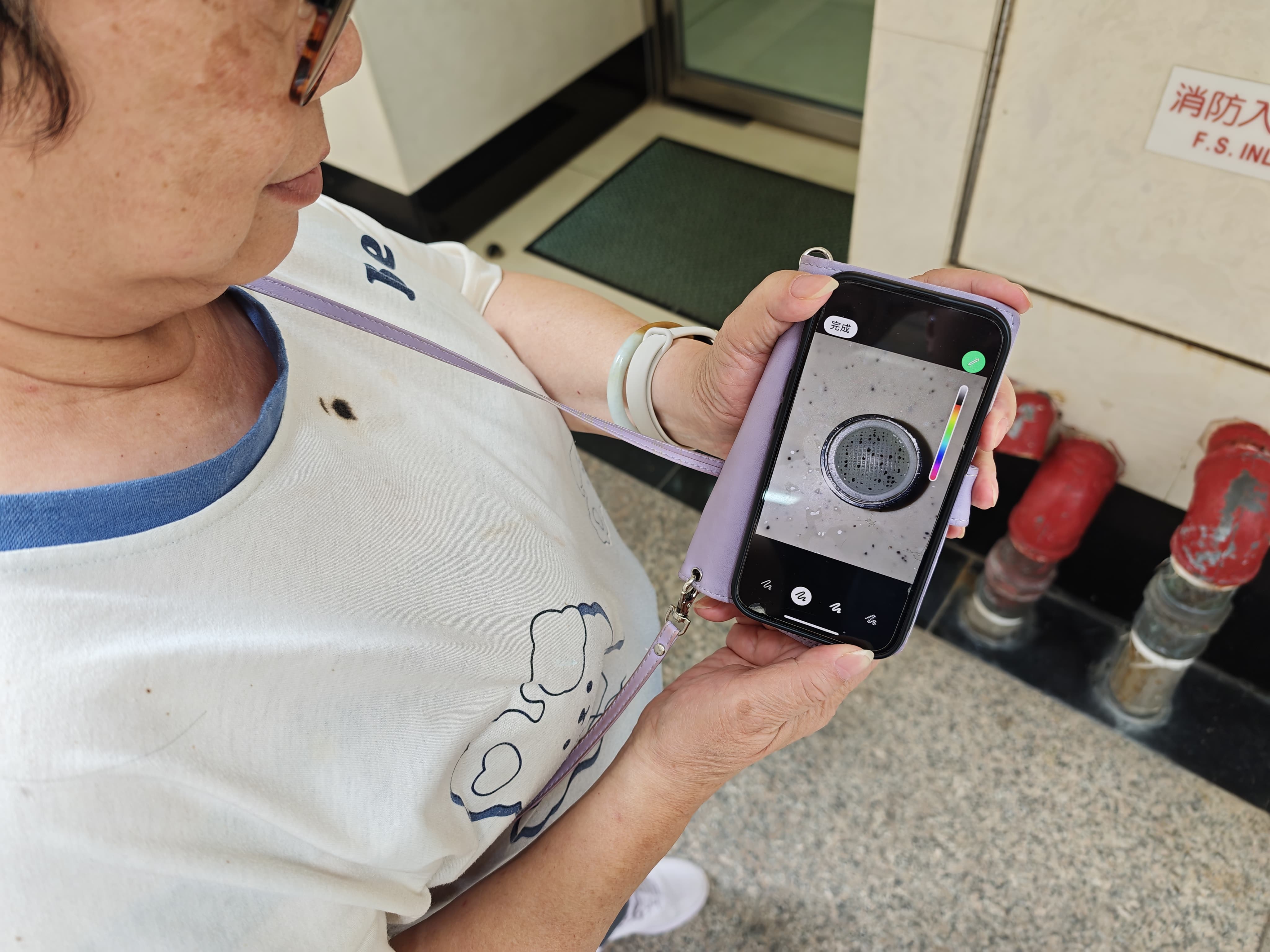 同廈住戶林女士表示,她家中食水前日起亦出現大量黑色小點,直言「好恐怖」。她向記者展示了今早拍攝的照片,赫然可見水管濾網上有數顆黑色顆粒。林女士將家中熱水器拆開觀察,沒想到「黑點」在內部也沾有不少。林女士告訴記者,情況並非個例,已有不少街坊到管理處登記投訴,還有部分居民因加裝濾水器而並未及時發現。在大廈樓下,點新聞記者看到門口已貼有相關告示,表示接獲業主反映食水有沉積物及水壓問題。