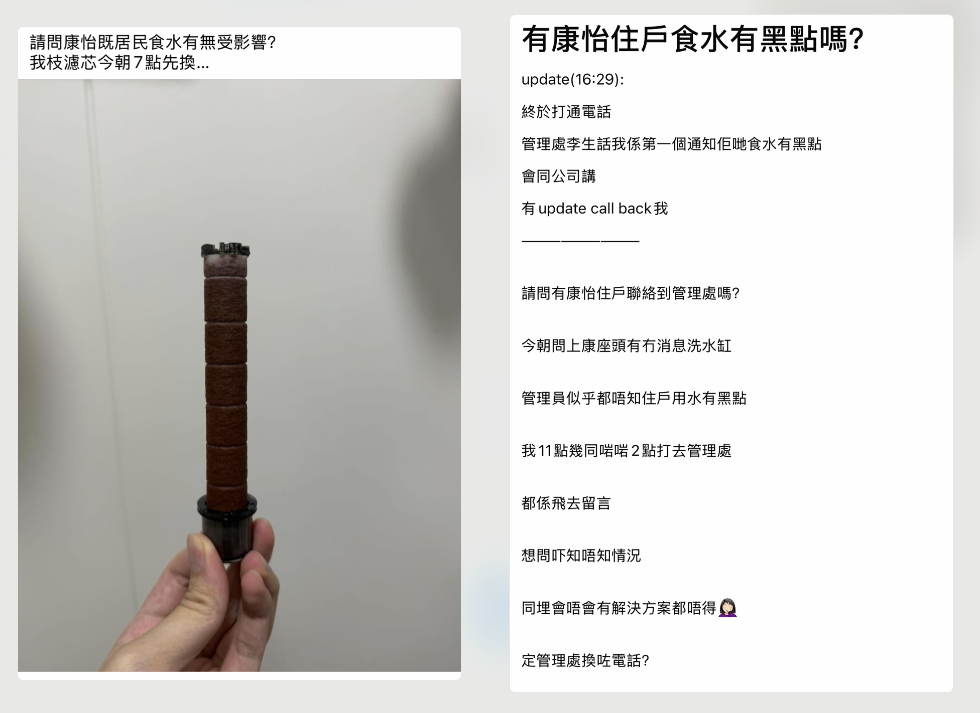 記者詢問康怡花園管理處,管理處工作人員向記者透露,確有住戶反應這幾日食水出現「黑點」。不過,在記者的隨機訪問中,住在G棟同D棟住戶反映有「黑點」,其他住客則表示未有留意。