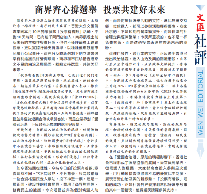 商界深知,穩定的政治環境、高效的政府治理、和諧的社會氛圍,才是最佳的營商氣候。因此,投票選出有能力、有擔當、懂經濟、貼民生的議員,直接關係到香港能否持續吸引投資、留住人才、推動創新。企業支持選舉,實則是保護自身賴以生存的制度根基。