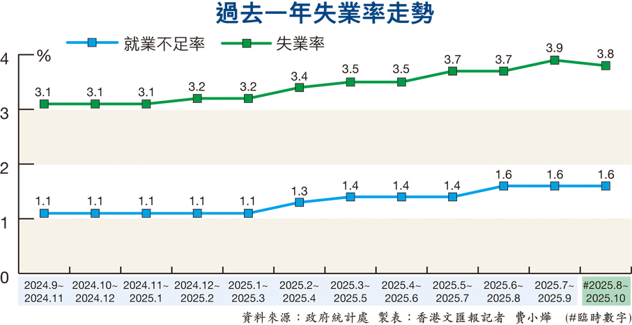今年8月至10月的失業率回落至3.8%,是繼2023年5月至7月後,相隔逾兩年首次回落。與今年7月至9月比較,總勞動人口減少約7,800人,多達382.2萬人;總就業人數減少約1,800人,達至367.3萬人;失業人數亦減少約6,000人至約15萬人;就業不足人數則微增約800人至60,800人。