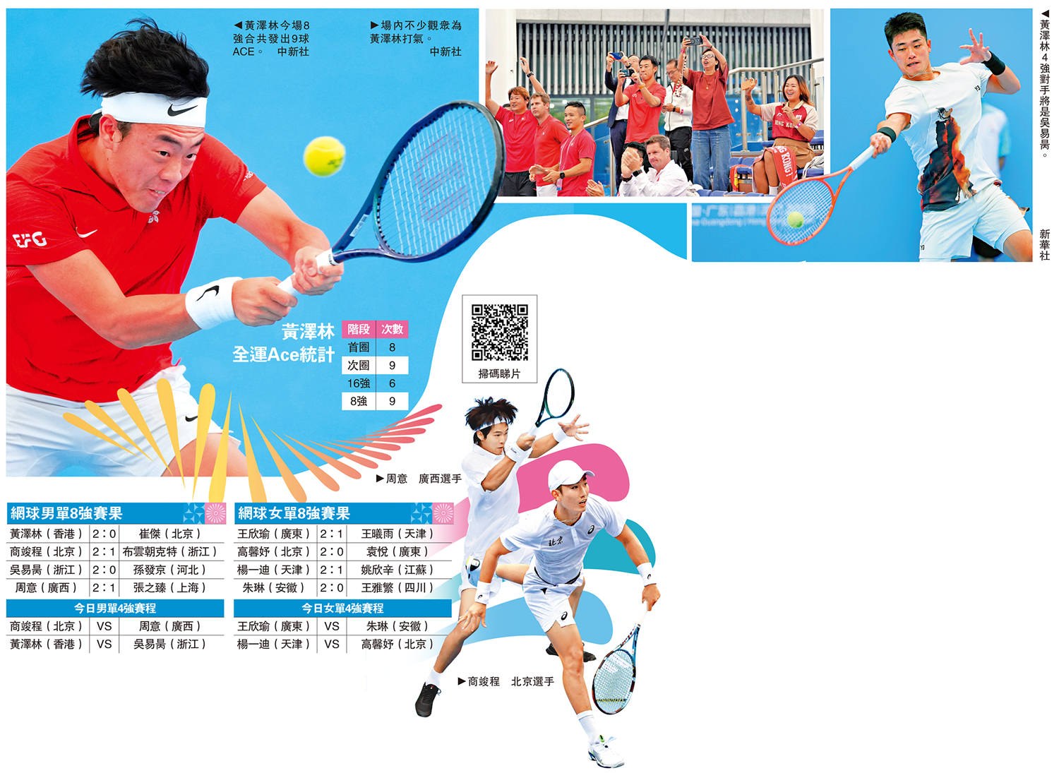 (大公報 記者 梁潤森)香港網球隊代表黃澤林鎖定第15屆全運會網球項目個人首枚獎牌。這名「港網一哥」於18日出戰在橫琴國際網球中心舉行的全運會網球賽男單8強,面對北京的崔傑,在作賽僅1小時23分鐘,合計發出9球ACE直接得分,以盤數2:0力挫對手晉級4強,由於賽事不設銅牌戰,黃澤林肯定穩奪獎牌。他今天會在4強對陣浙江的吳易昺爭入決賽,衝擊金牌。