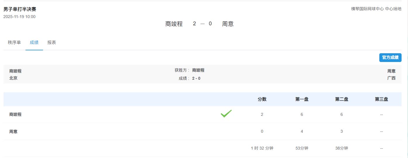 大公文匯全媒體報道,11月19日,全運會網球男單半決賽第一場剛剛結束,北京隊選手商竣程以2-0(6-4、6-3)完勝廣西隊周意,繼團體賽率隊奪金之後又打進了單打決賽。