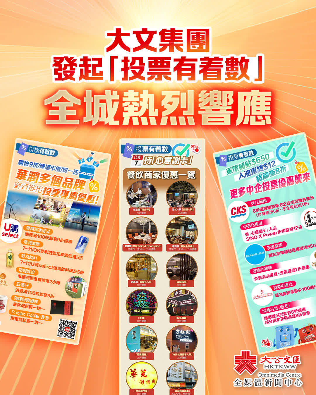 為鼓勵市民盡公民責任、積極參與投票,香港大公文匯傳媒集團獨家發起「投票有着數」活動,邀請商戶企業為已投票的選民提供優惠,獲各界熱烈響應。截至昨晚,有逾千間門店加入,涵蓋餐飲、購物、出遊、入油等,僅餐飲就有港式酒樓、火鍋店、米芝蓮餐廳、連鎖咖啡店等。選民憑投票「心意謝卡」更可在全港超過1,400家7-11和OK便利店,購買華潤集團旗下的啤酒和飲料等享有低至五折的優惠。