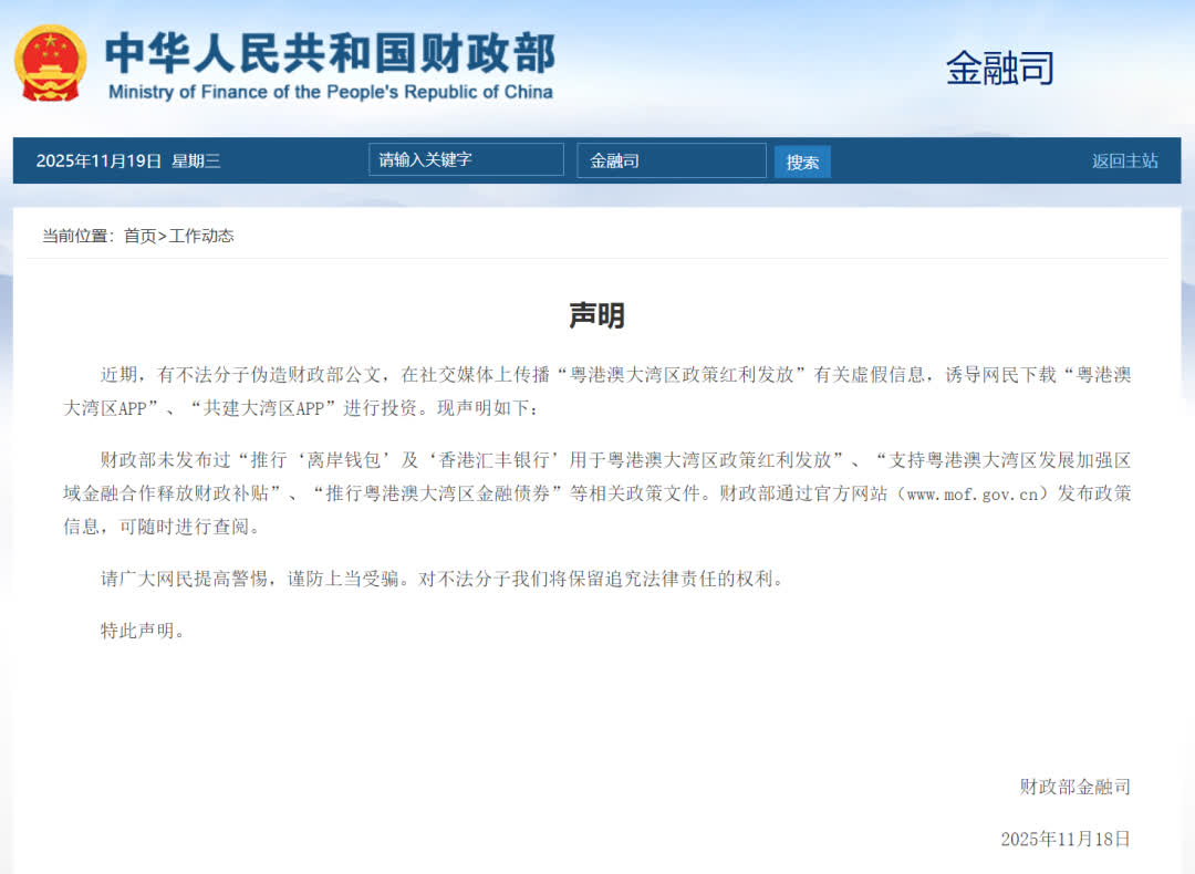 近期,有不法分子偽造財政部公文,在社交媒體上傳播「粵港澳大灣區政策紅利發放」有關虛假信息,誘導網民下載「粵港澳大灣區APP」、「共建大灣區APP」進行投資。現聲明如下: