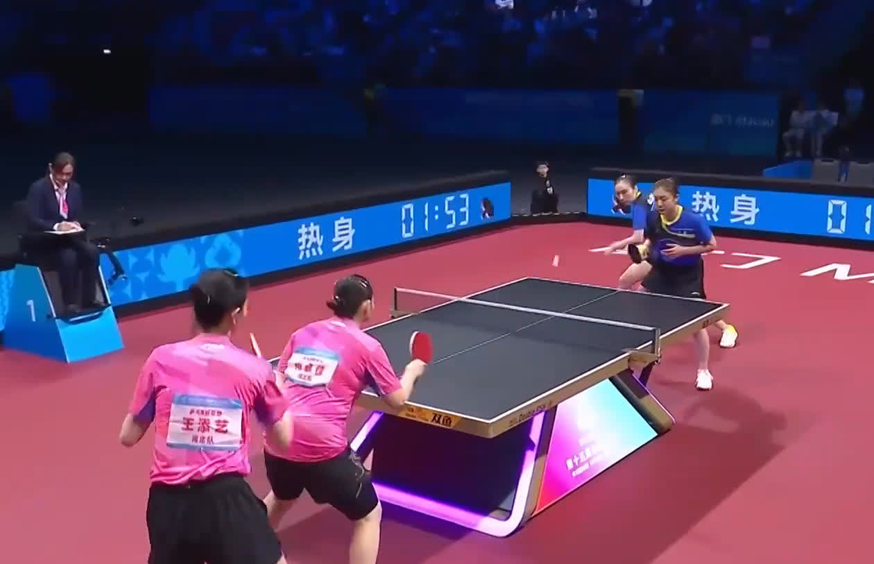 女團金牌賽迎來巔峰對決,孫穎莎坐鎮的河北隊對戰陳夢領銜的山東隊。團體賽採取五局三勝,雙打打頭陣,緊接着是四盤單打。