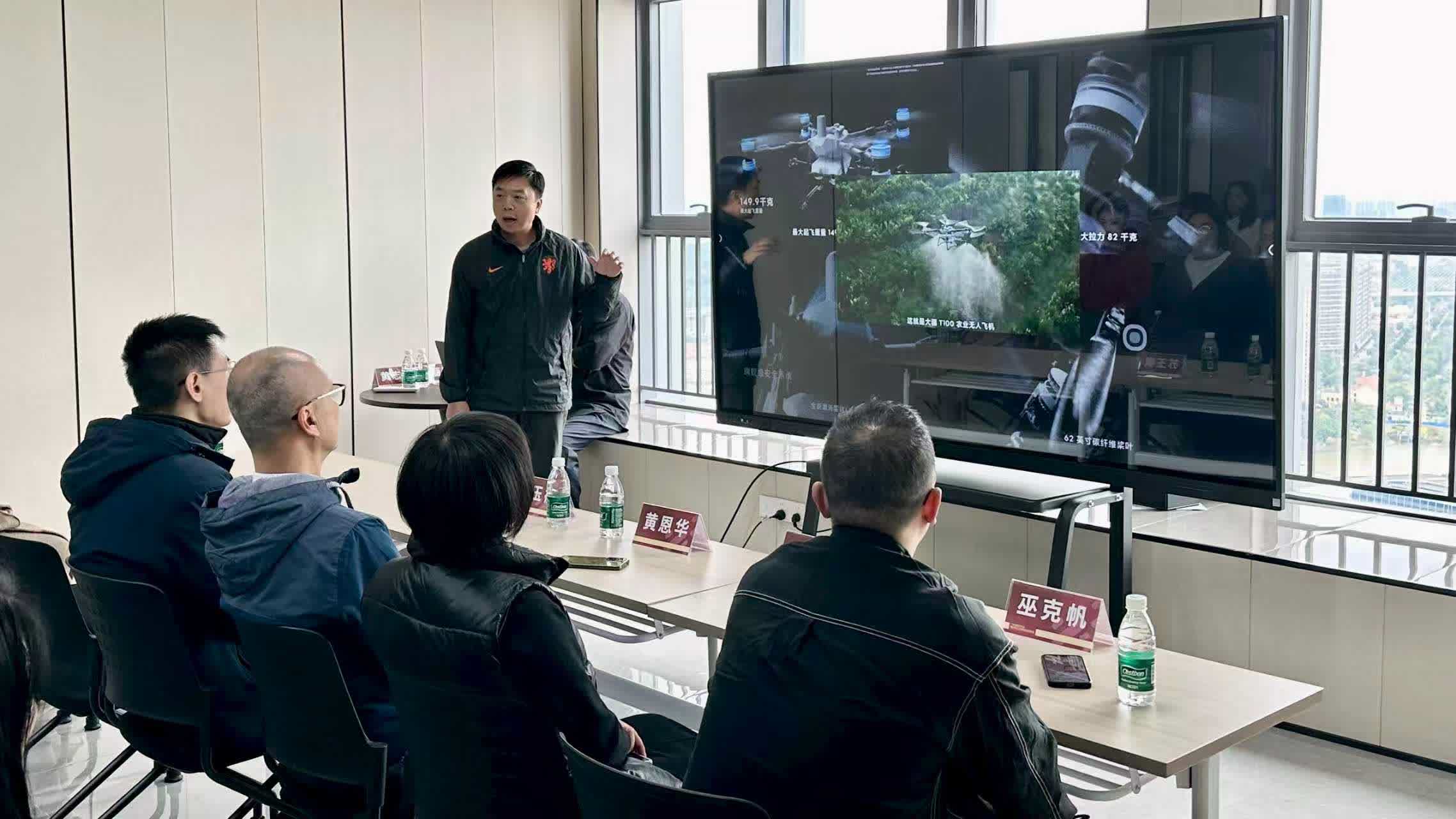 在主題分享環節,入駐企業代表——佛山市元基創新信息科技有限公司陳總以「低空航天器賦能現代農業」為題,介紹了無人機技術在作物監測、植保噴灑、農產品運輸及地形勘察等領域的廣泛應用。隨後,青年團移步至產品展廳參觀,感受基地內多家明星企業的創新成果,涵蓋保鮮技術、智能農機裝備、精深加工農產品等。