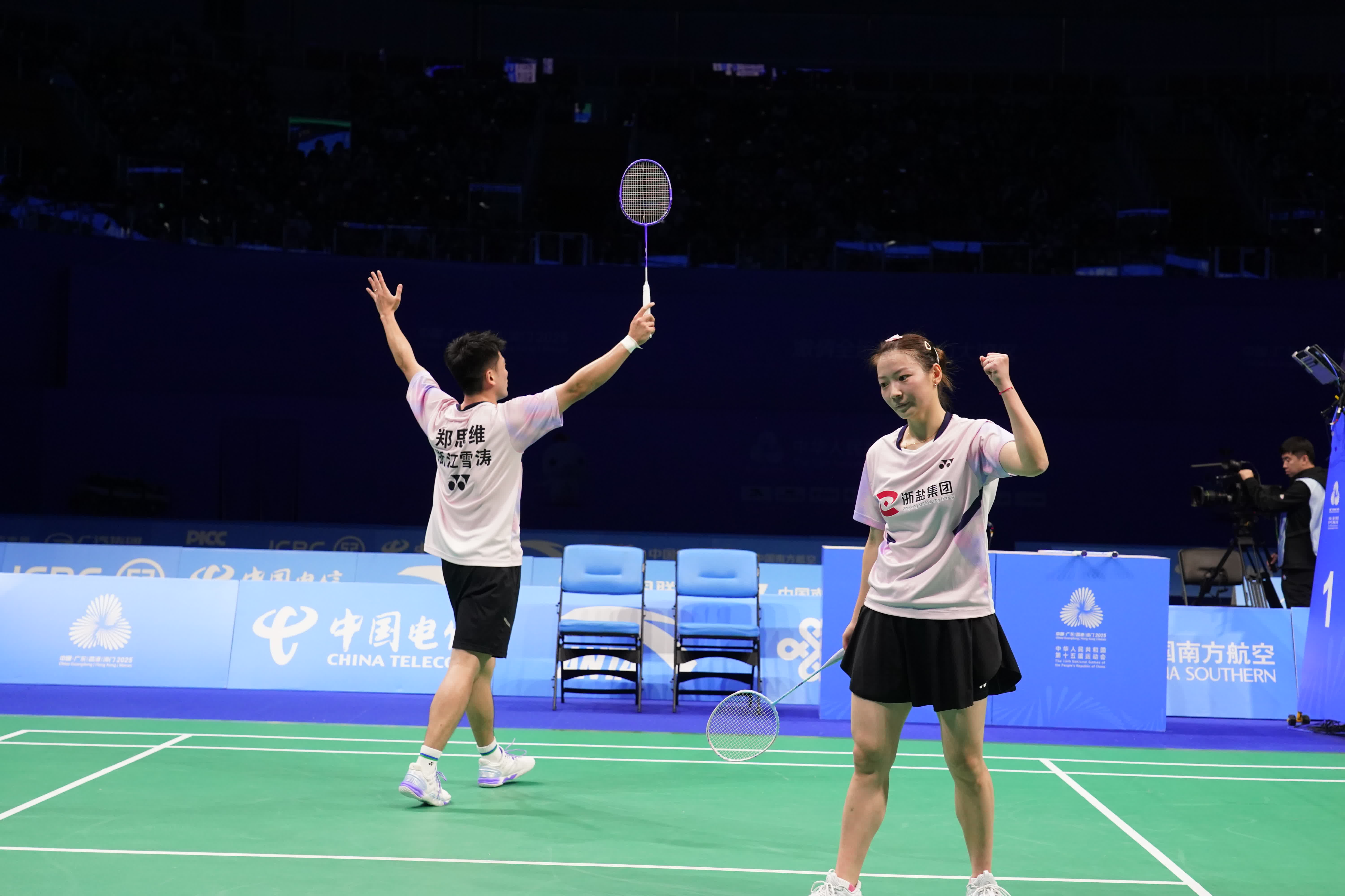 (大公文匯網 記者 郭若溪)11月20日,十五運羽毛球混雙決賽,浙江組合鄭思維/黃雅瓊組合2:0戰勝湖南組合周志宏/魏雅欣,獲得混雙金牌。兩局比分分別為:首局21:11,第二局21:10。賽後鄭思維/黃雅瓊分別將球拍和比賽球扔向觀眾席,並向觀眾致意。