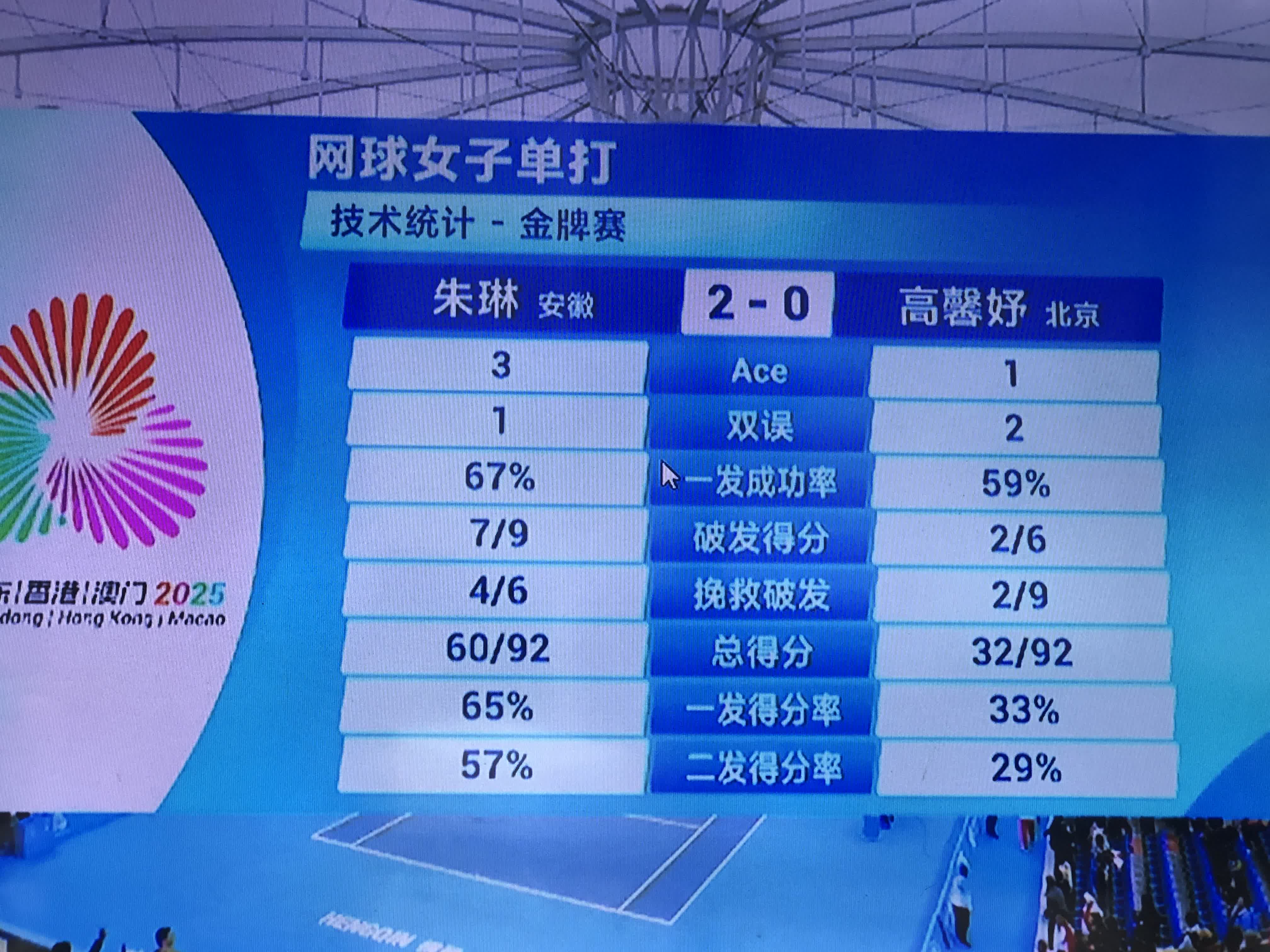 在決賽中,朱琳優勢明顯,首盤她便展現出強勁的競技狀態,以6:1先下一城;隨後又以6:2再贏一盤,擊敗高馨妤,成功奪魁。現年31歲的朱琳是全運會「老將」,這已是她第五次征戰全運會。此前她曾獲得3枚全運會銅牌,此番是她首次闖進全運會女單決賽,最終如願摘金,圓了冠軍夢。