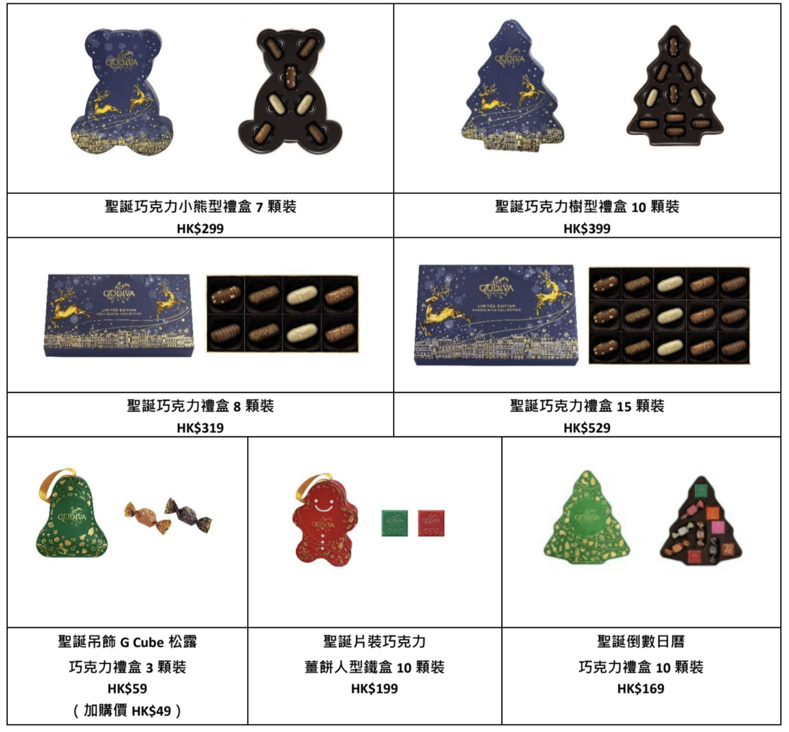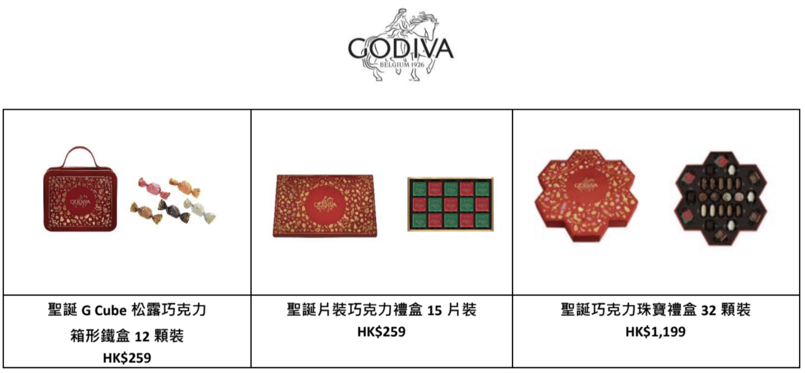 參與可獲贈以下禮品:巧克力聖誕樹;巧克力聖誕卡;GODIVA 聖誕限定巧克力;GODIVA 香氛蠟燭;GODIVA禮券;GODIVA 品牌圍裙(總值 HK$1,200)