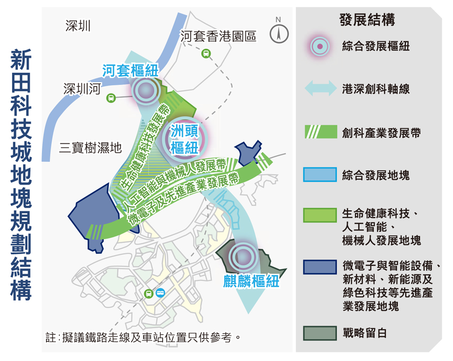用地布局包括「三個樞紐、三個產業發展帶」,即由北至南的河套樞紐、洲頭樞紐及麒麟樞紐,以及生命健康科技發展帶、人工智能與機械人發展帶、微電子與先進產業發展帶。規劃重點包括從研發到中試融合的產業生態設計,打造「以產優城、以城引人、以人築產」的良性循環;以「產業觸媒」帶動創科產業集群生態發展;並根據不同創科產業的空間需求差異,提供「產業導向」的空間形態;並提供支援創科產業發展的配套設施。