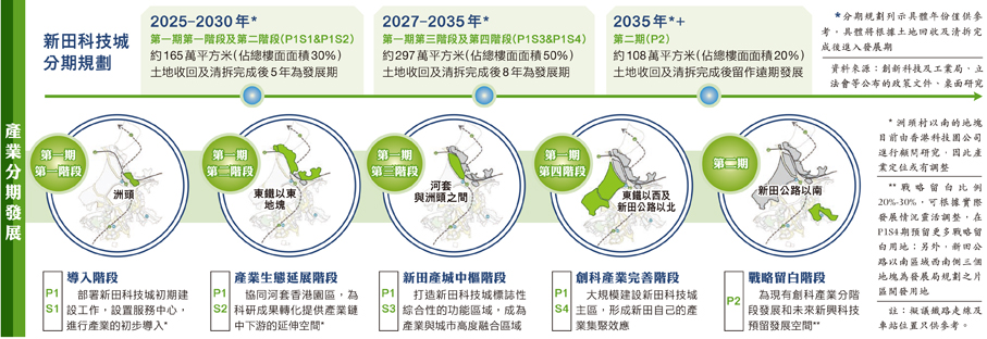 《綱要》提出的五個發展階段包括:產業初步導入階段;為科研成果轉化提供產業鏈中下游延伸空間的產業生態延展階段;打造新田科技城標誌性綜合功能區域的新田產城中樞階段;大規模建設新田科技城主區的產業完善階段;以及最後預留發展彈性的戰略留白階段,以支援未來新興科技產業。