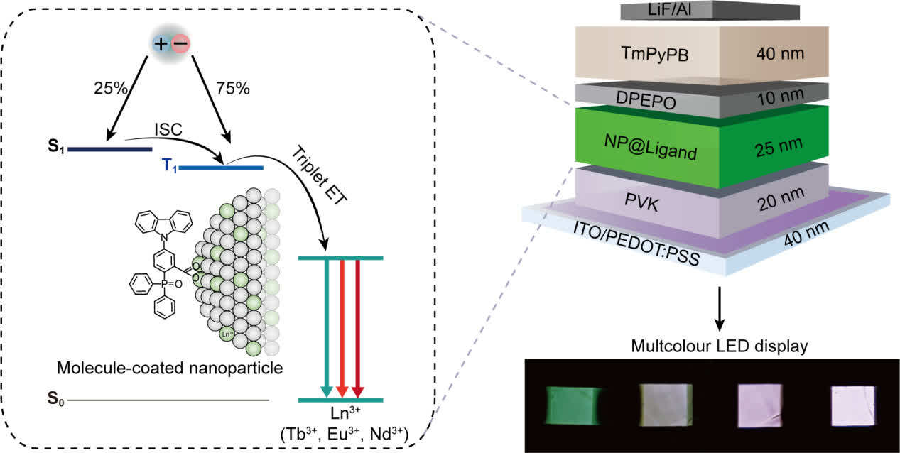 面對傳統「硬闖」電荷注入的思路困境,許輝教授、韓春苗教授與韓三陽副教授、劉小鋼院士等組成的跨校團隊,在長達十四年的合作中,逐漸達成一種共識:電荷既然自己進不去,我們能不能把電荷所攜帶的「能量」送進去?他們借鑒自然界光合作用的智慧,提出「巧建橋樑」的創新方案——在稀土納米晶表面修飾精心設計的功能配體,構建起無數座有機「光電橋樑」。「這些有機配體對於納米晶就像『葉綠素』對於『植物』,植物(納米晶)無法直接利用光(載流子),而是通過葉綠素(有機配體)的光合作用(半導體性質)先把光能(載流子)儲存到營養物質(能量)中,再供給植物(納米晶)生長(發光)。」許輝教授形象比喻道。團隊篩選出的最佳分子CzPPOA,能量捕獲效率接近100%,傳遞效率高達96.7%,成功實現能量的精準遞送,讓「天塹變通途」。